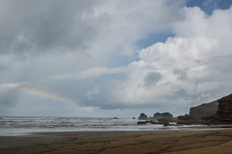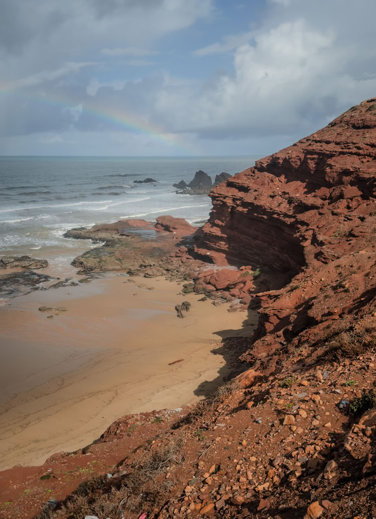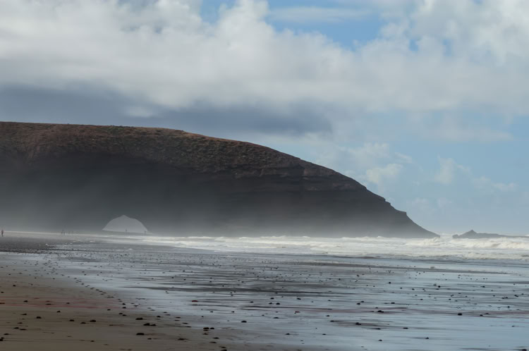 Letztendlich fahren wir eineinhalb Stunden bis Legzira an die Küste bis wir uns sicher fühlen. Der Nachtwächter am Campingplatz guckt leicht irritiert, macht aber um 1:30 Uhr die Schranke auf, fotografiert die Pässe ab und wir können schlafen. Die nächsten 24 Stunden haben wir heftigen Sturm bis 65 km/h. Dann ist der Spuk vorbei und die Sonne scheint wieder.