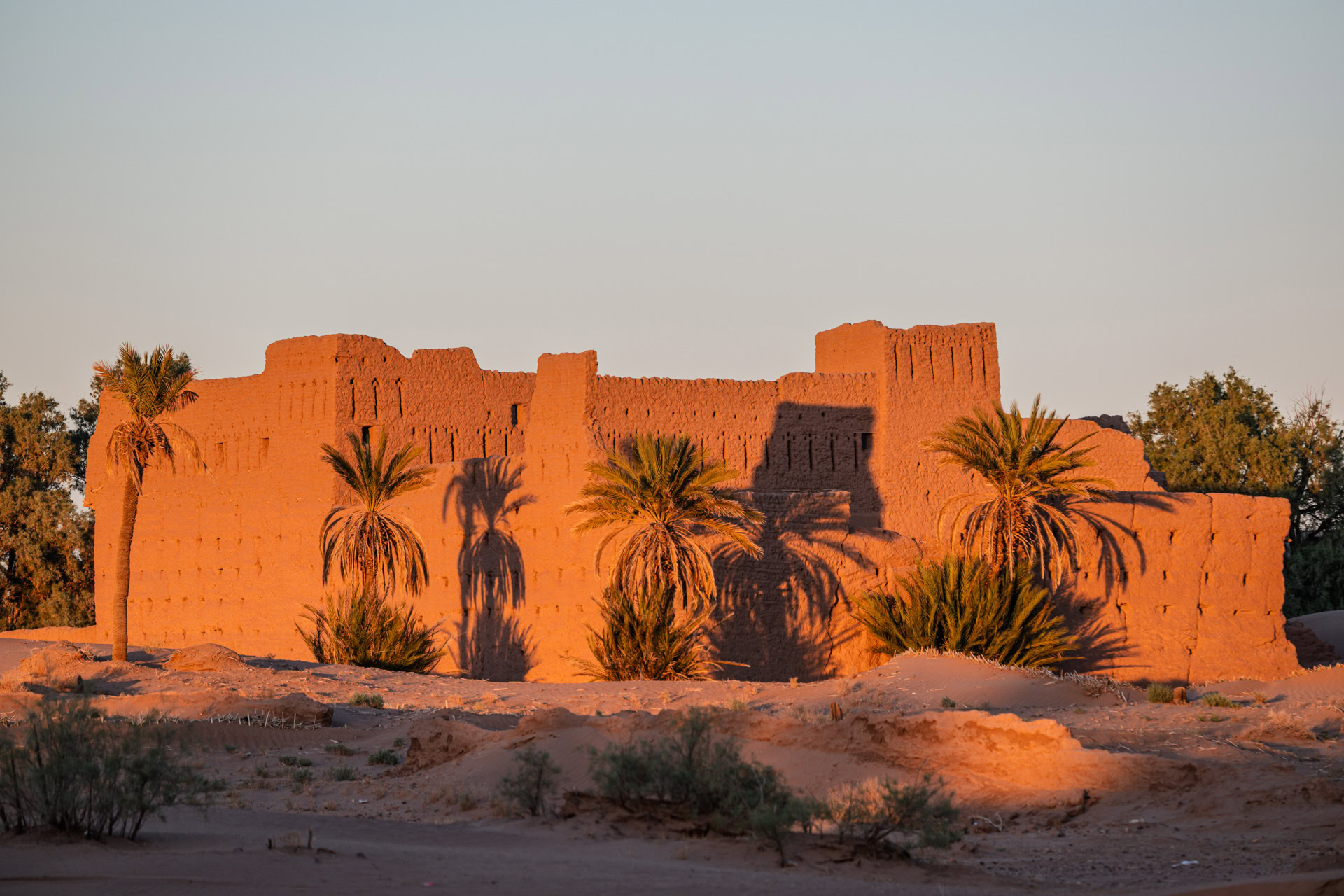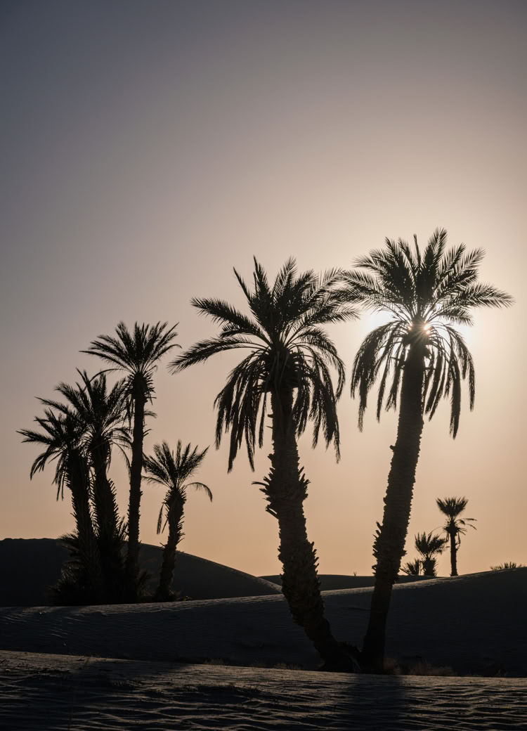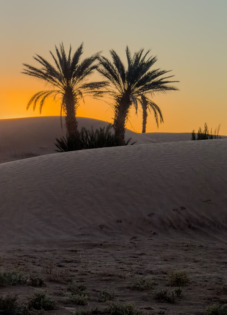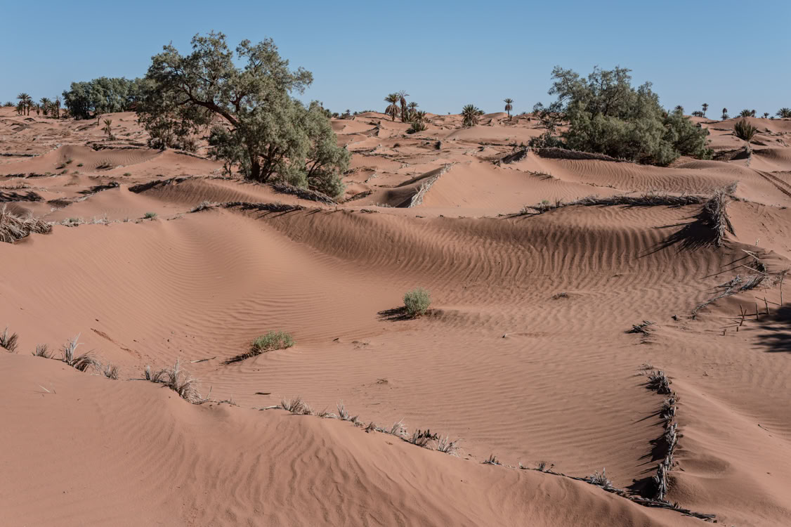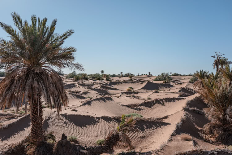 In M’Hamid liegt am Rande der Sahara. Ein Schritt aus dem Auto und wir stehen auf der ersten Düne! Und es sieht ganz so aus, als ob die Sahara hier nicht halt macht, sondern gerade die Bäume unserer nächsten Umgebung unter sich begräbt. Es sind Schutzbarrieren aus Palmenblättern angelegt - ähnlich Schneebarrieren in den Alpen - , die den Sand vom Weiterkrabbeln abhalten sollen. Wie lange haben sie Erfolg?
