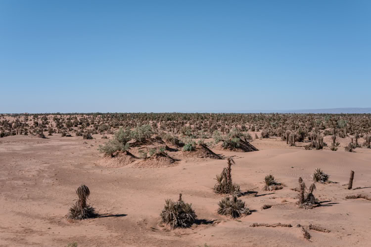 Die Trockenheit der letzten Jahre trägt zum schnellen Fortschritt der Verwüstung bei - im wahrsten Sinne des Wortes. Wir spazieren durch die verdorrten Palmplantagen. Die Bewässerungsanlagen früherer Jahre sind noch gut zu erkennen. Obwohl im oberen Verlauf des Drâas Staudämme angelegt wurden, die der Wasserknappheit entgegen wirken sollen, ist hier nichts davon zu spüren. Man behauptet sogar, wegen (!) der Staudämme gibt es kein Wasser mehr.
