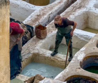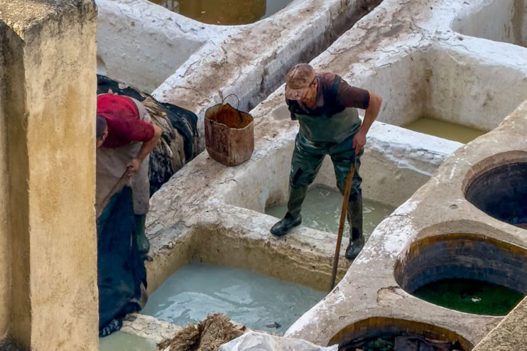 - Mit diesem Arbeiter in der Gerberei von Fès möchten wir nicht tauschen. Zwar stinkt es nicht so extrem wie erwartet, aber ist die Brühe dafür vielleicht um so giftiger?
