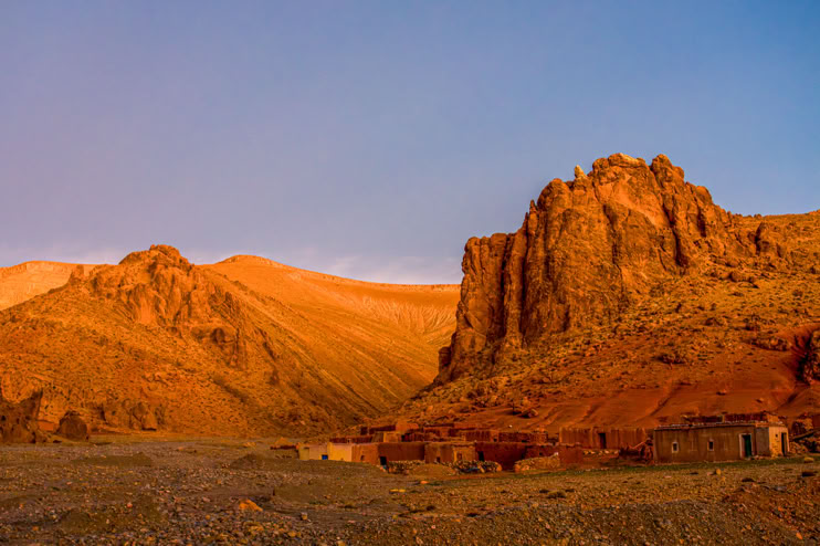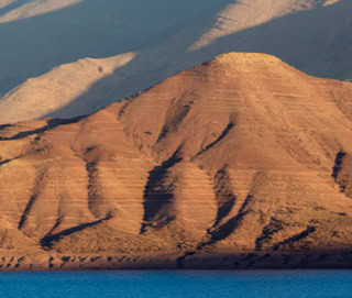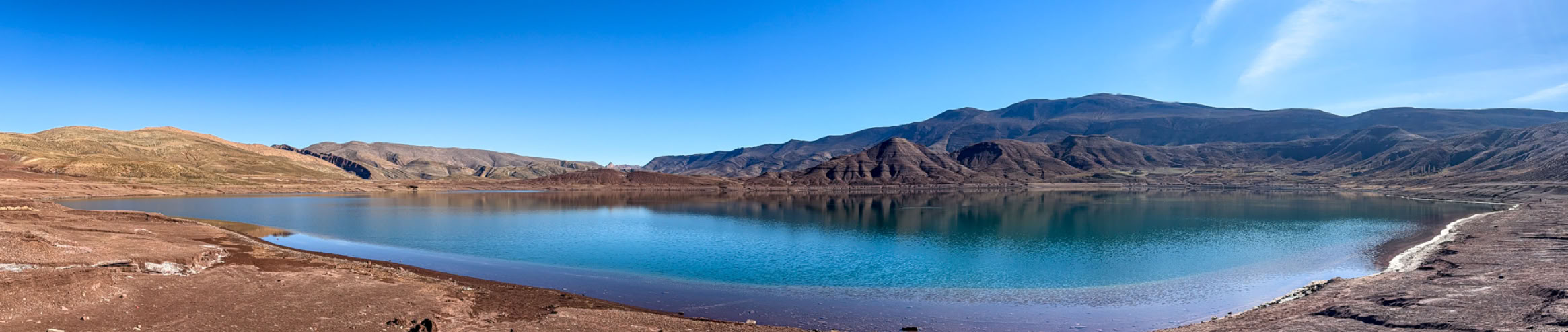 - Ein toller Kontrast: Der tiefblaue See Isli im Nationalpark Hoher Atlas ist umgeben von erloschenen Vulkanen, die in der Sonne leuchten.