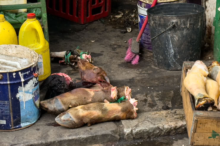 - Immer wieder kommen wir zurück zu den Souks, die so urtümlich sind, dass sie uns anstrengen. Aber bei genauerer Betrachtung ist es ja vielleicht gar nicht schlecht, persönlich Bekanntschaft zu machen mit dem Tier, das man später auf dem Teller hat … Nicht dass der falsche Eindruck entsteht. Hinter dem Rinderkopf liegt das Fleisch sehr appetitlich in der Kühltheke, den Blut beschmierten Hackklotz gibt es eher selten.