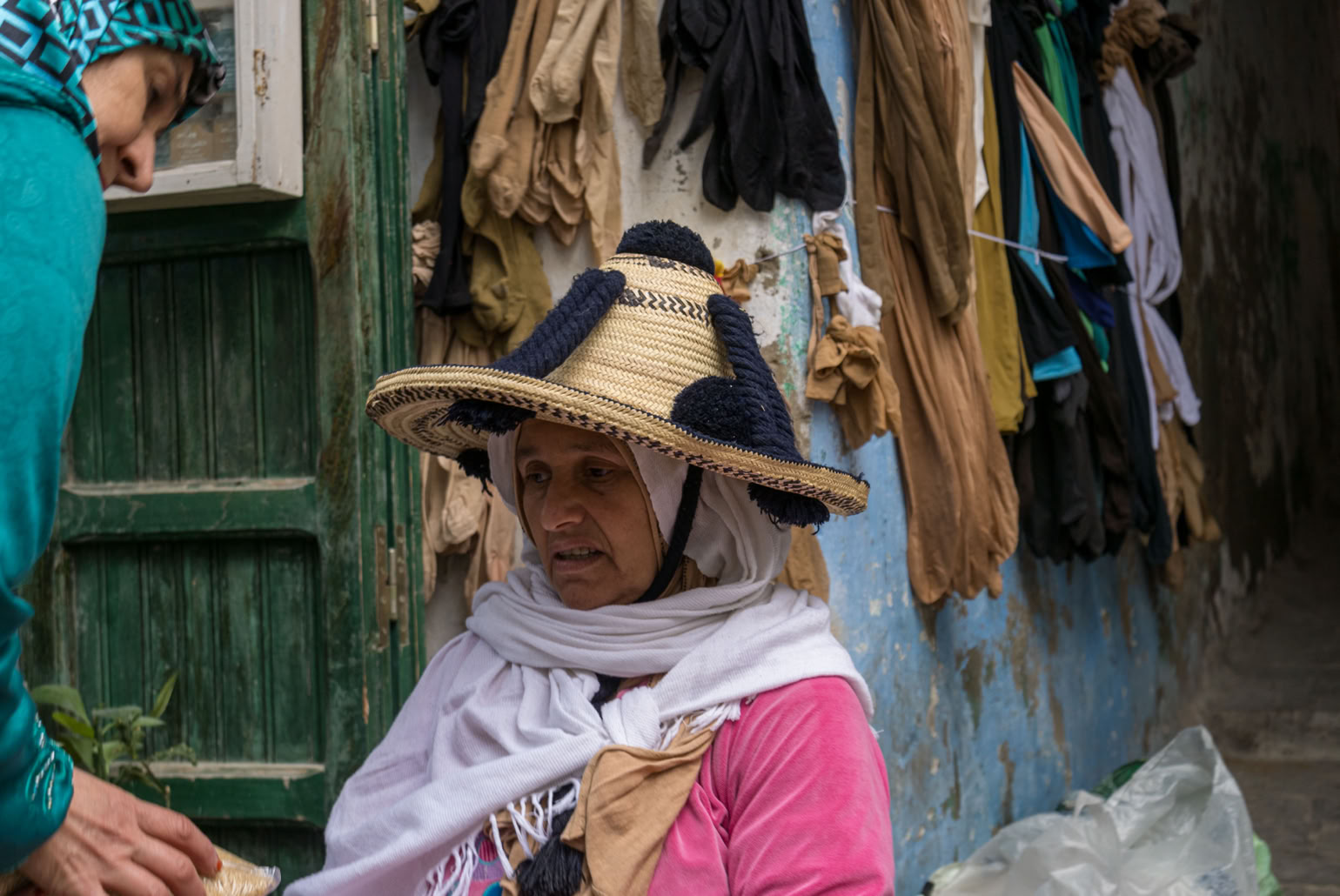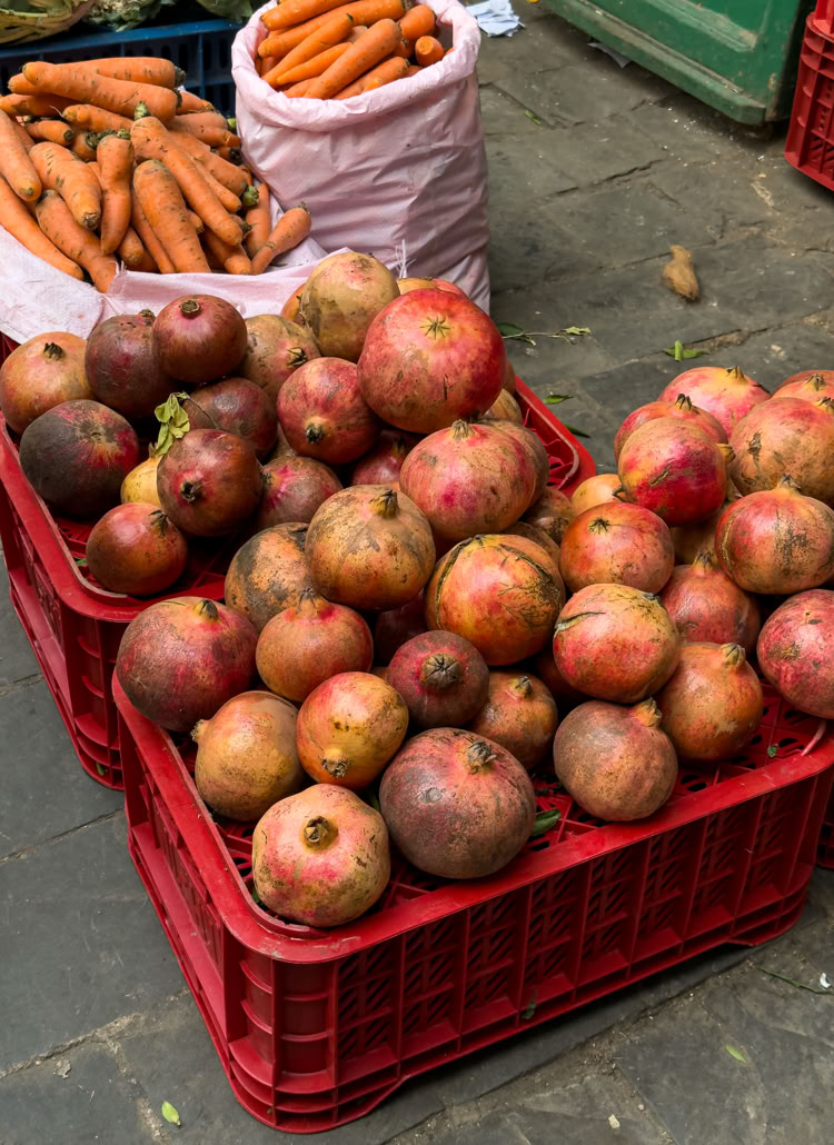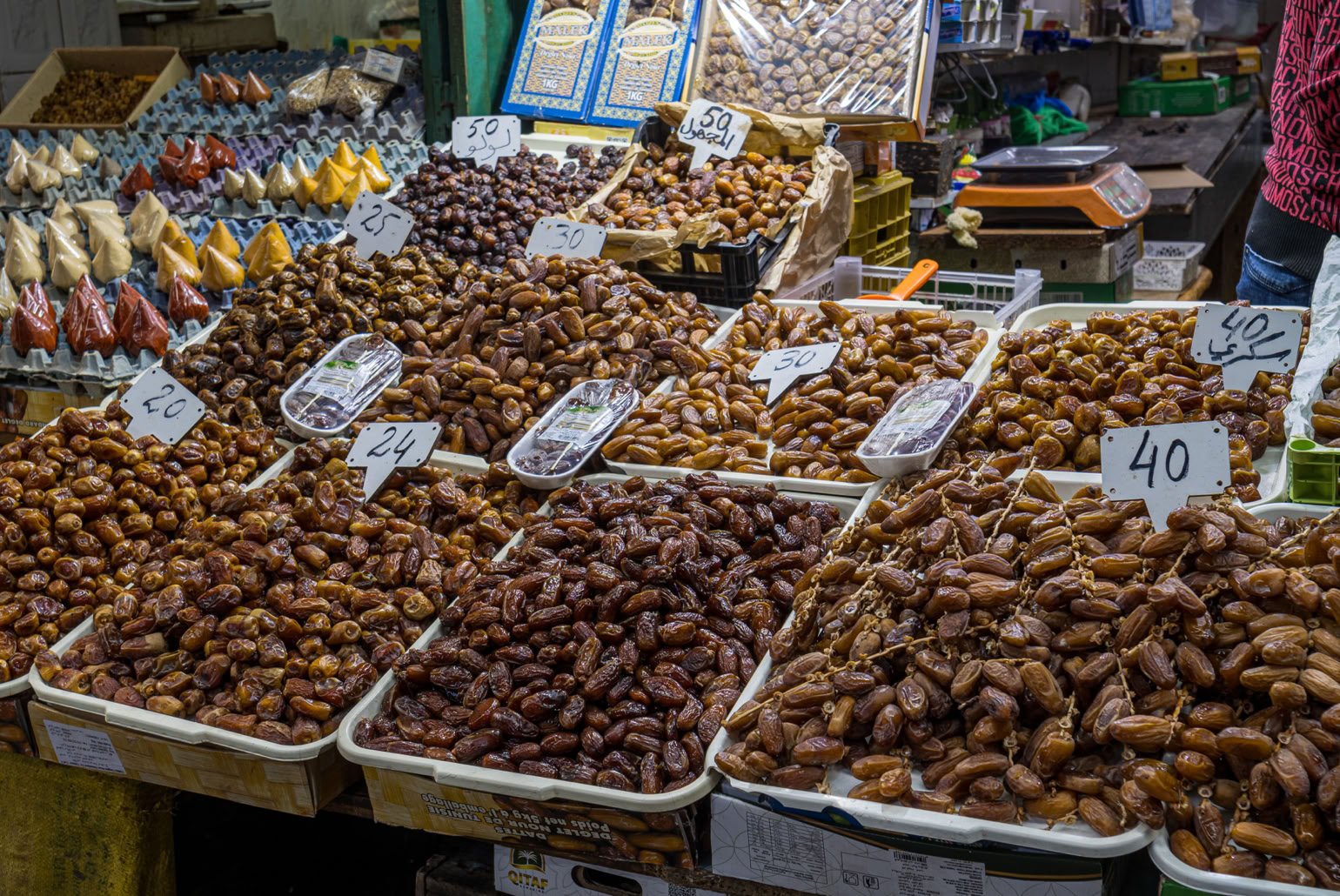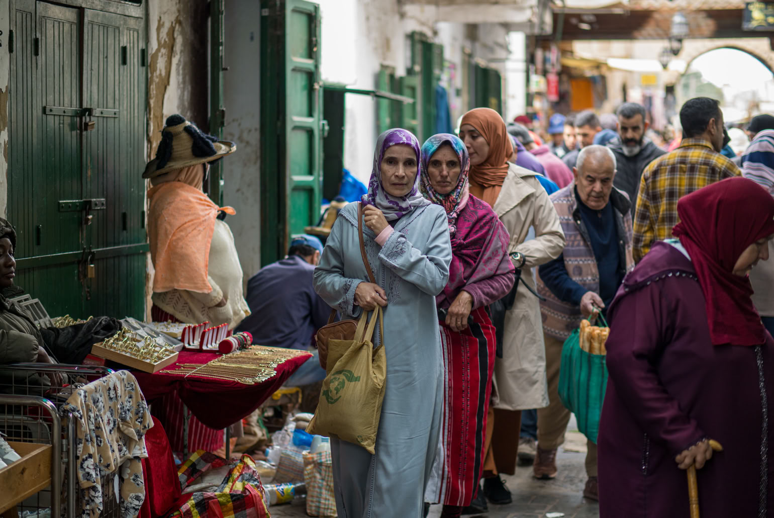 Frisch gebackenes Brot aus dem Holzofen, Waschmaschinen, Flaschen, Korken, wieder Brot, Spitzenstoffe, Patisserie, alte Schuhe, ein alter Koffer, Gartenhandschuhe, Stecknadeln, Feinstrumpfhosen und wieder Brot. Nussgebäck mit Sesam, Eier, Nähmaschinen und Souvenirs für Touristen. Käse - können wir später kaufen, Barbershop, Fernbedienung, abgehakte Rinderfüße vor den Gerbern, Fladenbrot, Linsen und Erbsen, wieder Fladenbrot, Datteln und Feigen, Suppengemüse, Tempos und Kinderwindeln - einzeln! Gebrauchte Tennisbälle und Kinderklamotten und echtes Baguette - schau mal! Rostige, krumme Nägel, kaputte Eimer, Glühbirnen, Batterien, Hoodies, Kakteen, Boxen, Rosinenbrot, Spinat, uralte Handys, ein Stück vom Kürbis, eine kaputte Gitarre, jede Menge nicht Erkennbares...