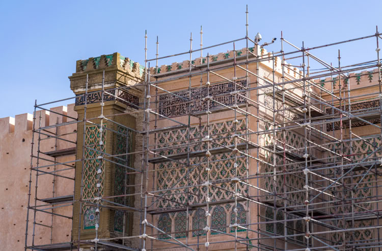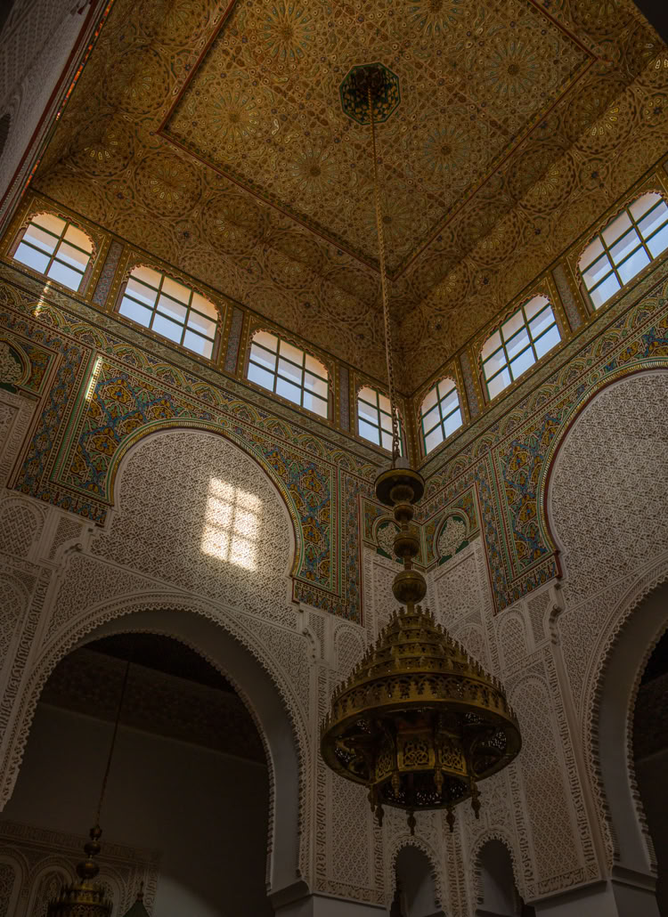 Leider ist das Bab el Mansour wegen Renovierungsarbeiten eingerüstet und am Palast schleichen wir nur an den Mauern entlang, aber das Mausoleum können wir besichtigen. Ob es sich in einem solchen Prunkbau trotz der blutigen Taten ruhig schlafen lässt?