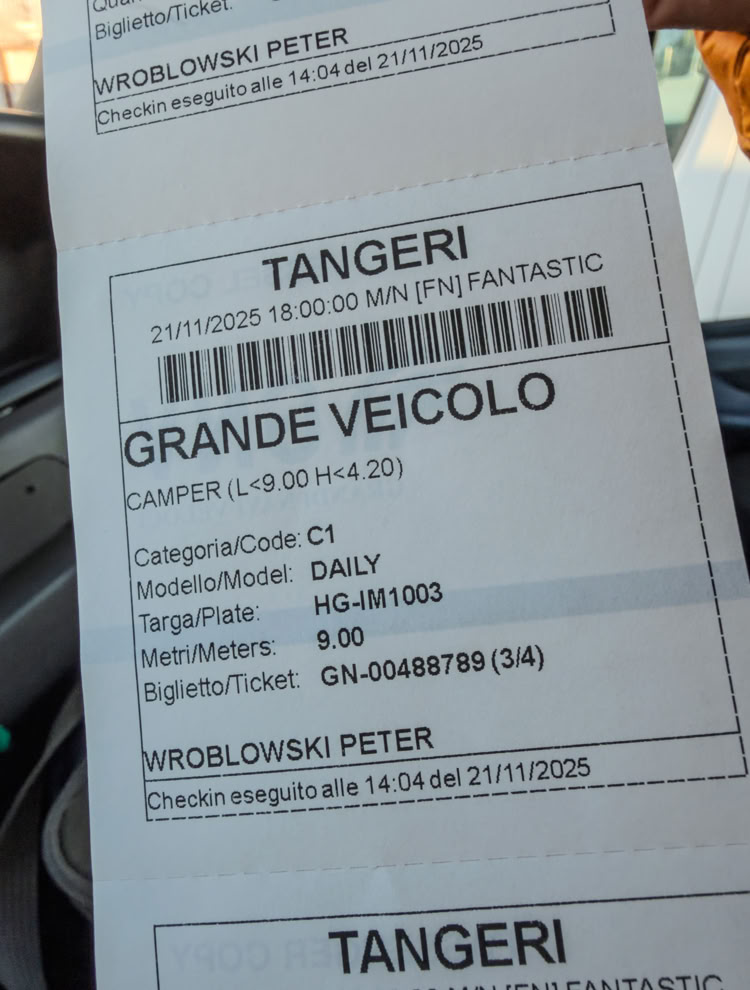 Wir reisen jeweils mit einer Fähre von GNV an, aus Genua bzw. Sète nach Tanger Med. Das dauert ziemlich genau 2 Tage.