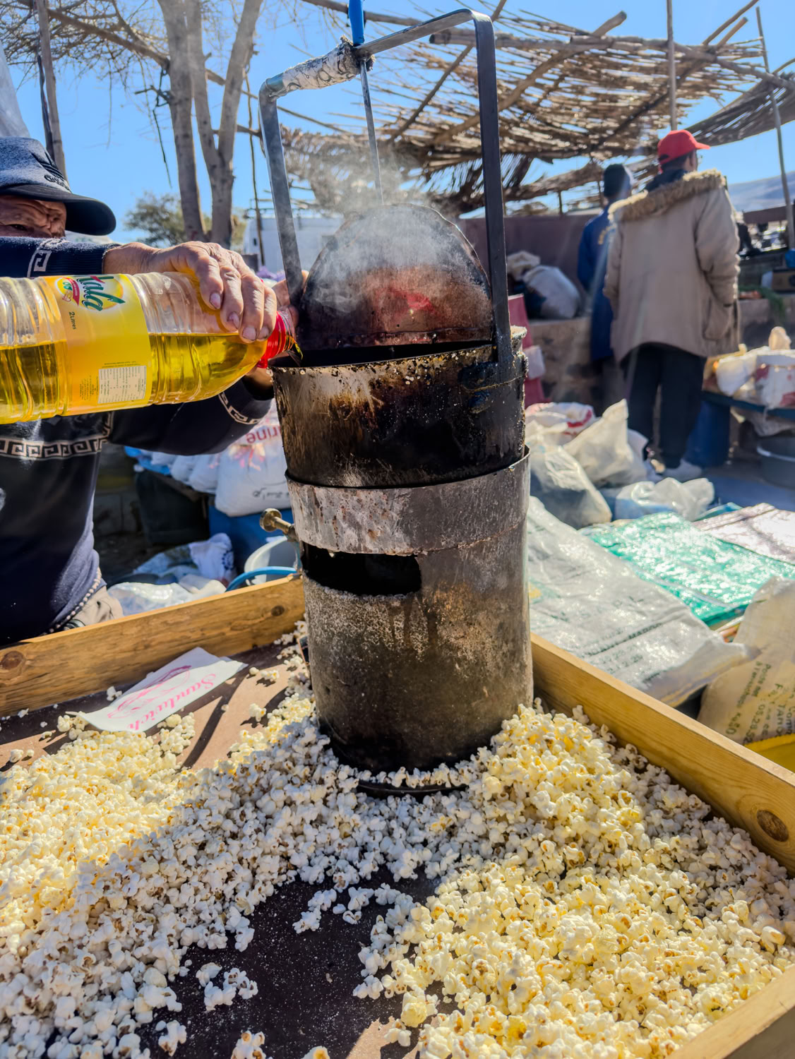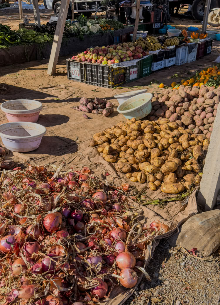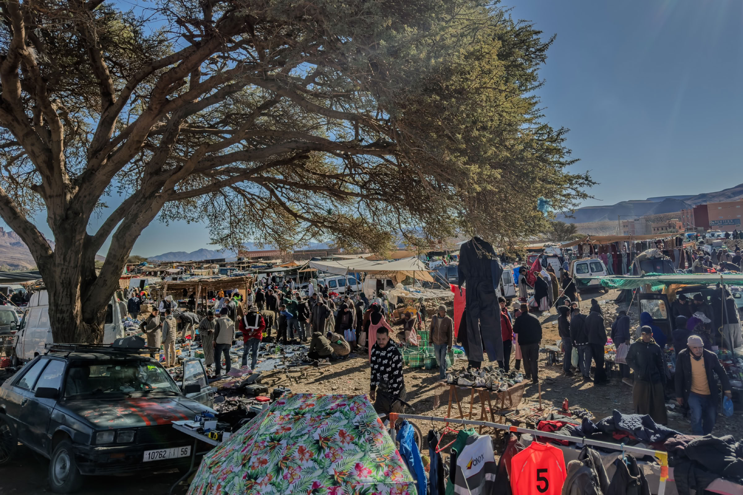 Meine Notizen zum Souk in Agdz lauten: Noch nie hat man sich weniger um uns gekümmert als heute auf dem Souk in Agdz. Keiner ist uns hinterhergerannt, keiner wollte uns was andrehen. Einen angenehmeren Einkauf haben wir in Marokko noch nicht erlebt. Aber eingekauft haben wir! Fünf Kilo Obst und Gemüse. Und heute zum ersten Mal auch Fleisch. Genauer gesagt Lammfleisch, was zum Zeitpunkt des Schreibens schon zu Gulasch verarbeitet und mit Bohnen vertilgt wurde.