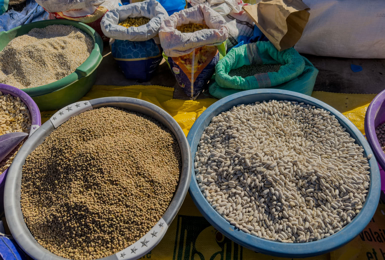 Das meiste Zeug liegt auf dem Boden, man schnappt sich eine der Plastikschüsseln, füllt sie mit allerlei und geht dann zum Mann an der Waage. Der hat eine große Kiste neben sich stehen mit allem, was er im Angebot hat. Wozu? Er füllt alle Einkäufe auf ein Kilo auf: noch 2 Handvoll Bohnen, noch 3 Tomaten, 5 Mandarinen. Er nimmt auch mal eine Kartoffel weg…