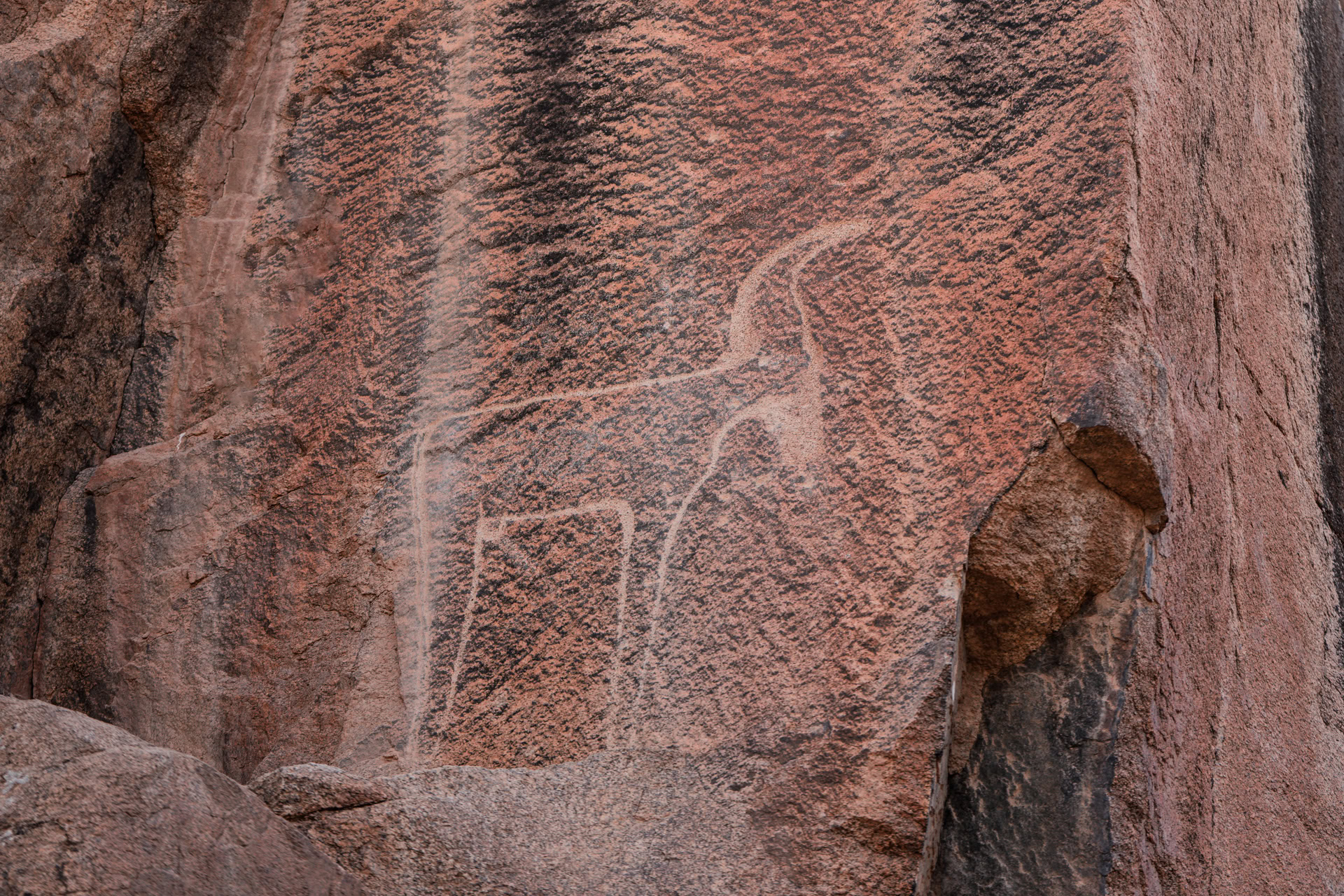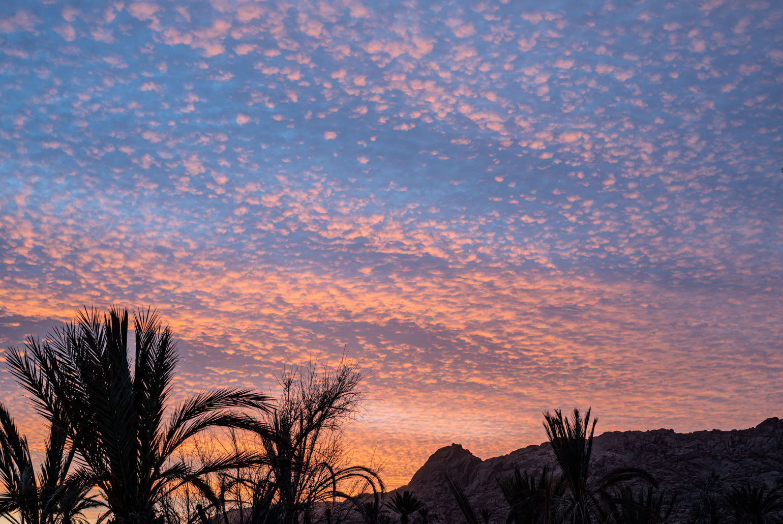 Das erste Foto zeigt die Gazelle, wie sie in der Wand hängt, das zweite unseren Stellplatz in einem „gerupften“ Palmenhain, der nur 200 Meter von der Gazelle entfernt ist.
