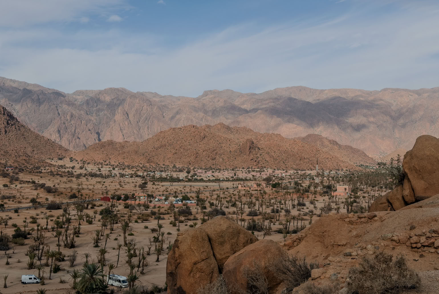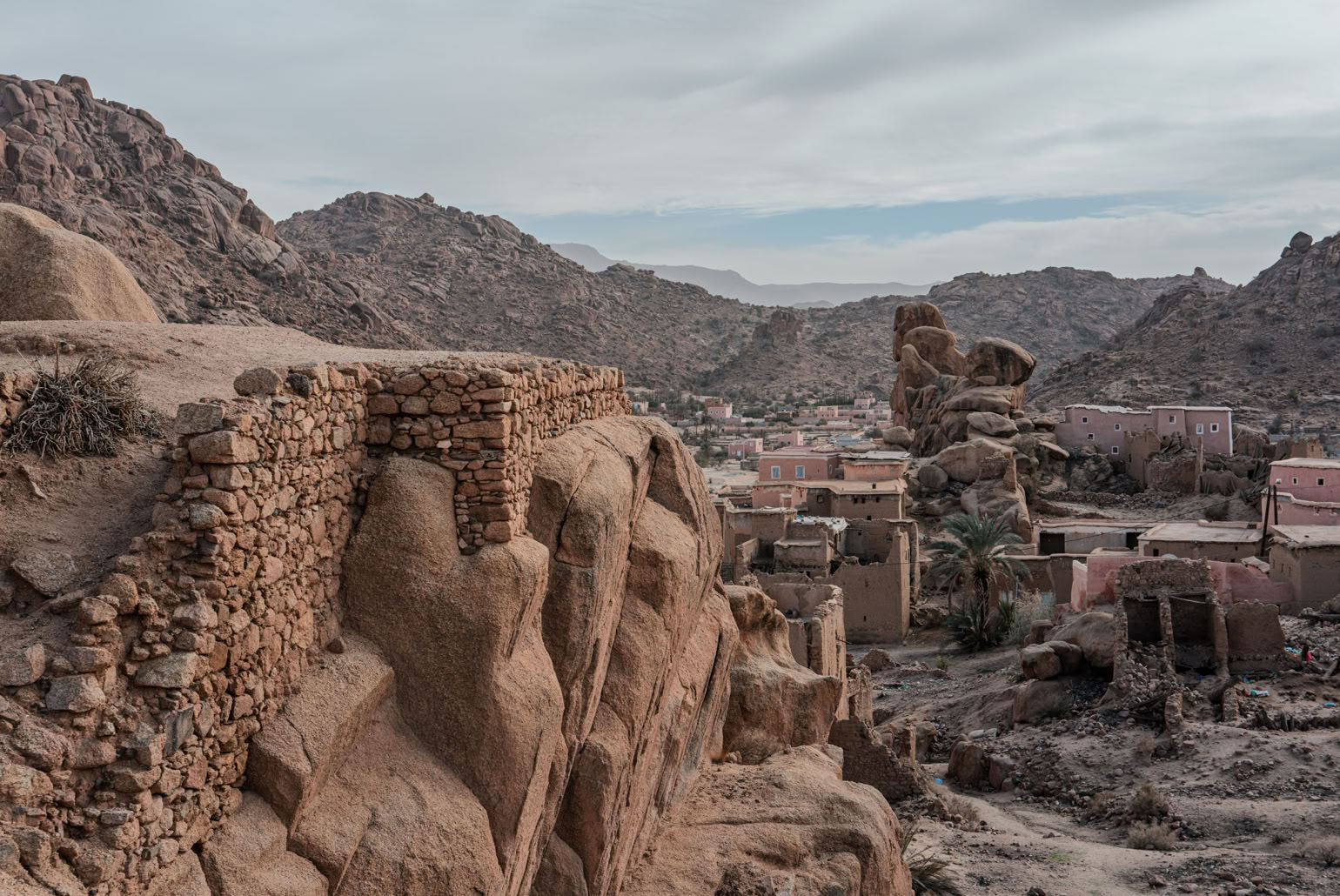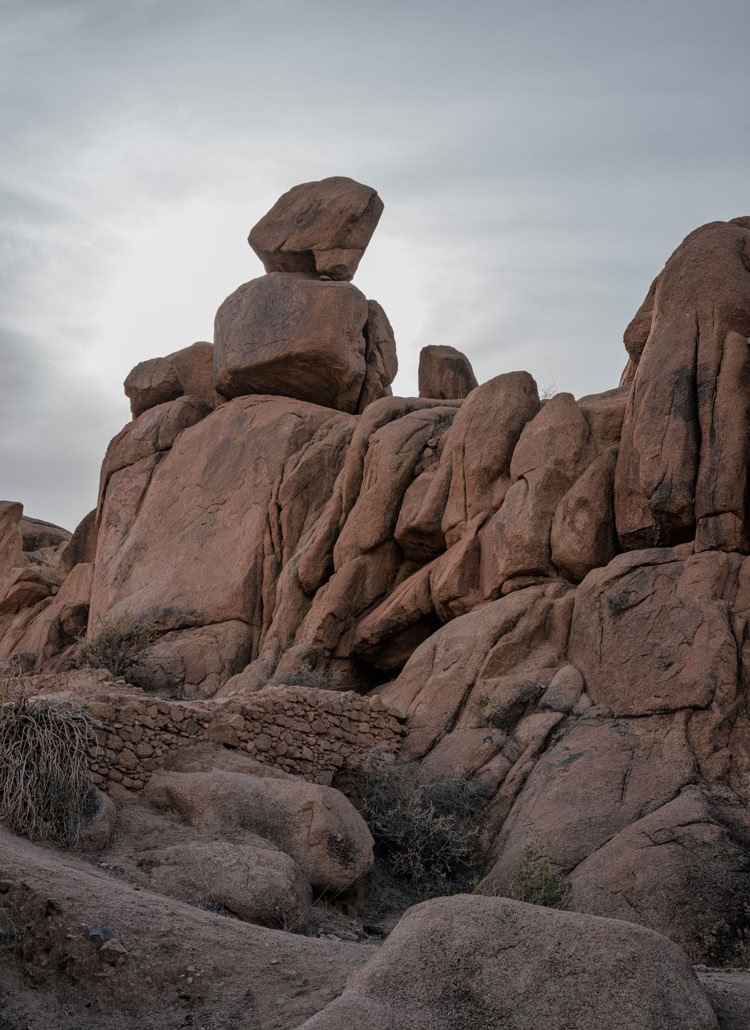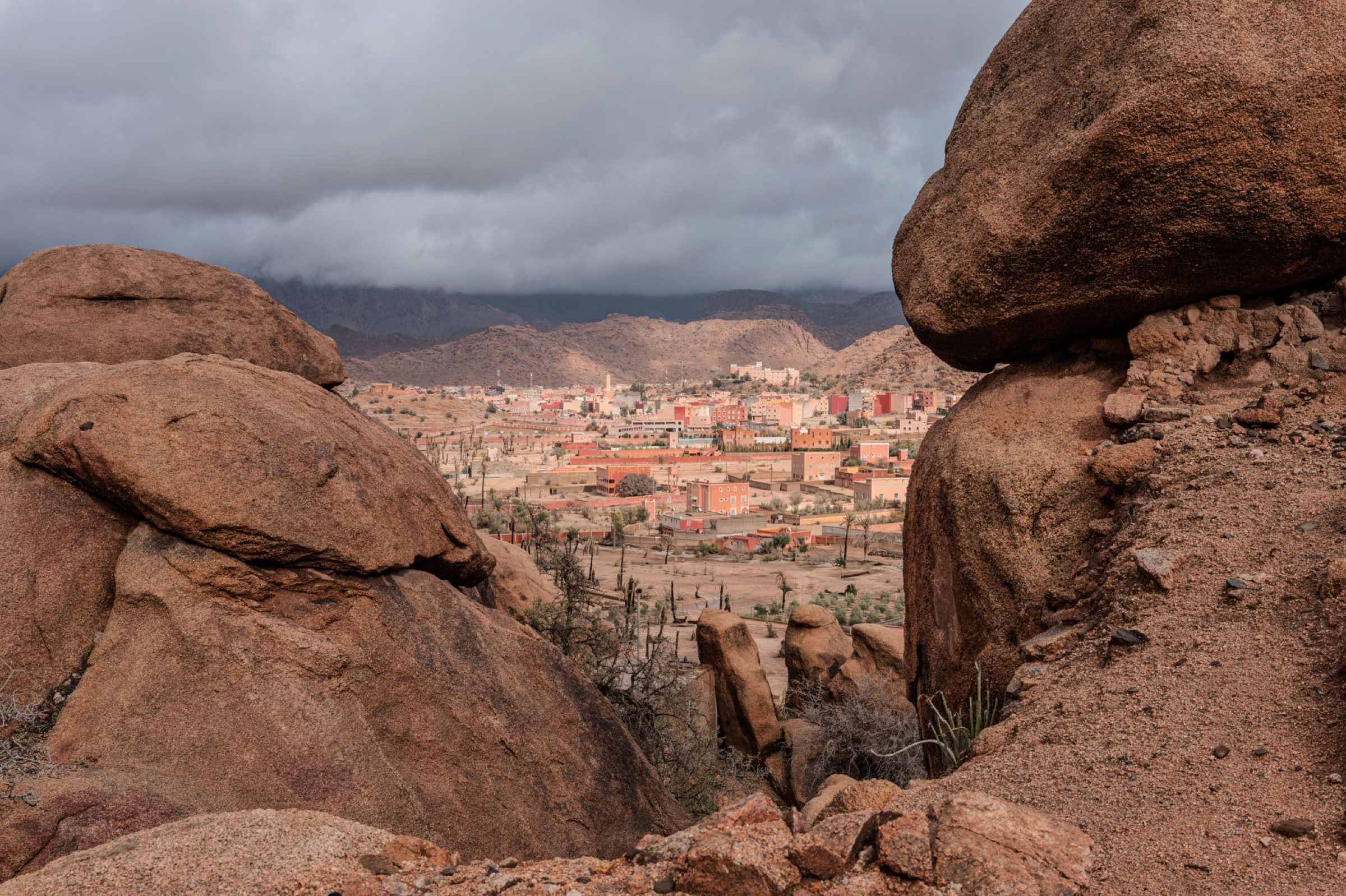 Tafrarout ist eingebettet in eine außergewöhnliche Landschaft. Das, was wir im vorhergehenden Beitrag als Giants’ Playground beschrieben haben, setzt sich rund um das Städtchen fort. Beim Wandern klettert man eigentlich immer durch irgendwelche Felsen. Und beim Blick von oben auf die Stadt sieht man, wie die Häuser sich an die Hänge schmiegen oder auch mal ein herumliegender Fels ins Haus integriert wird.