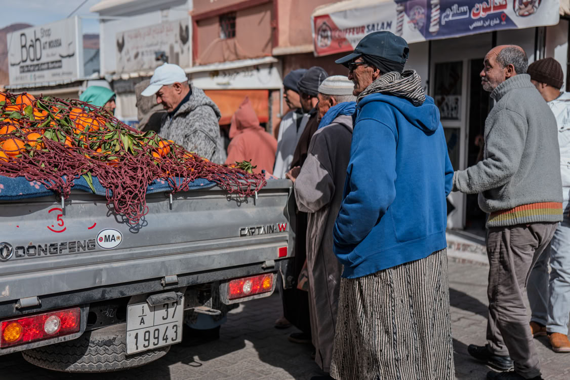Beim Schlendern durch Tafrarout geraten wir wie schon öfter in das Freitagsgebet. Wir brechen das Schlendern ab, denn die Betenden stehen in Reihen quer auf der Straße vor der Moschee. Sie freitags wohl zu klein.