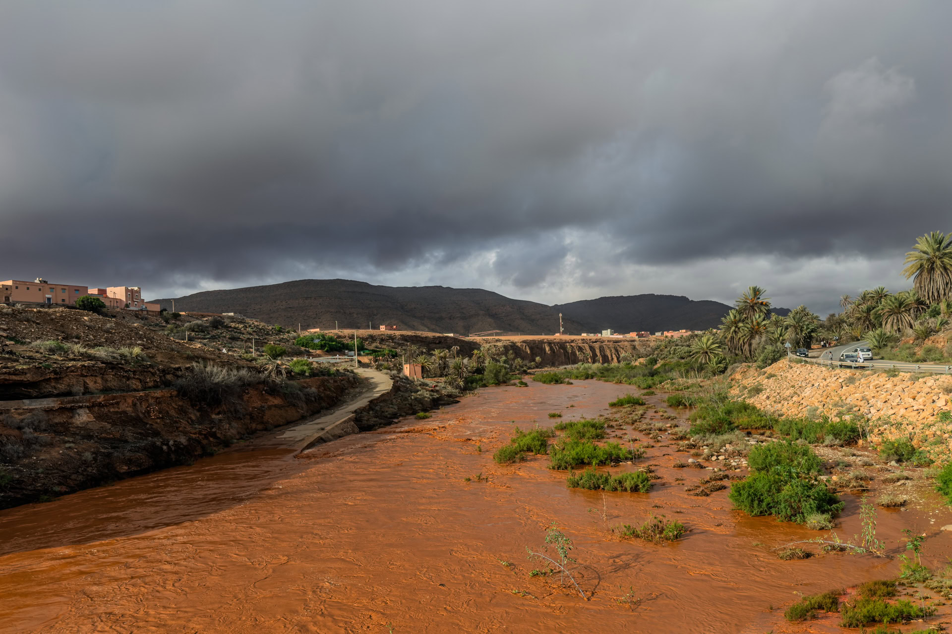 Wir bekommen in Tafrarout gleich drei der wenigen Regentage mit. Auf unserer Weiterreise Richtung Küsten fahren wir entlang reißender, brauner Schlammbäche.