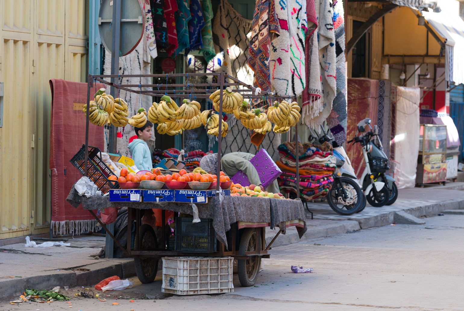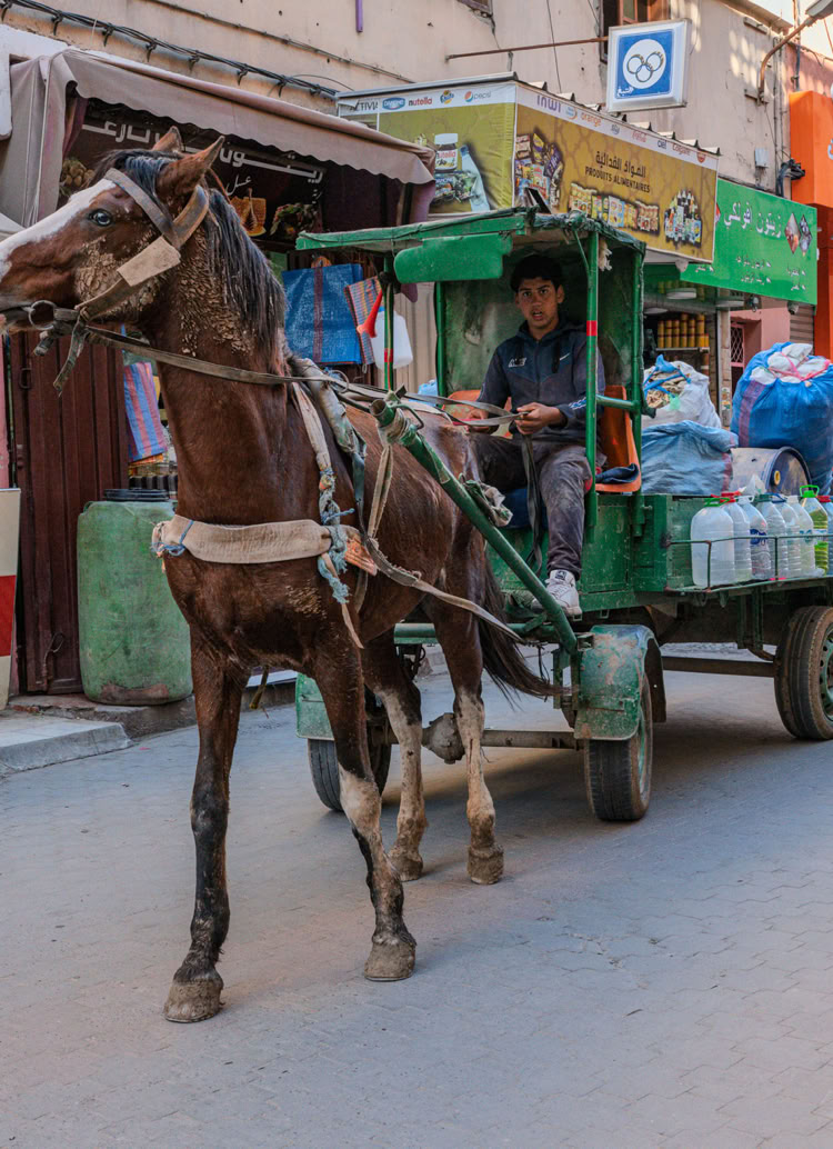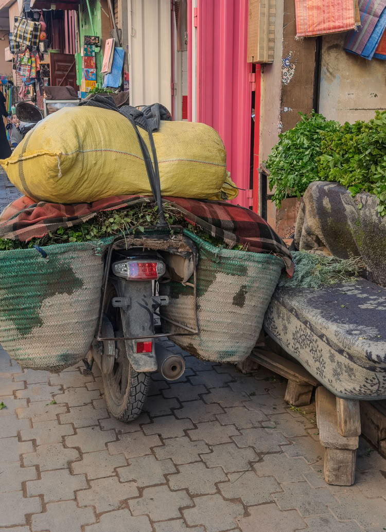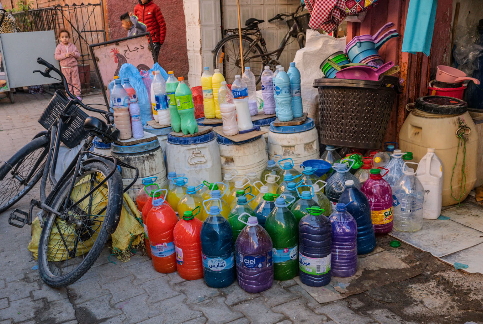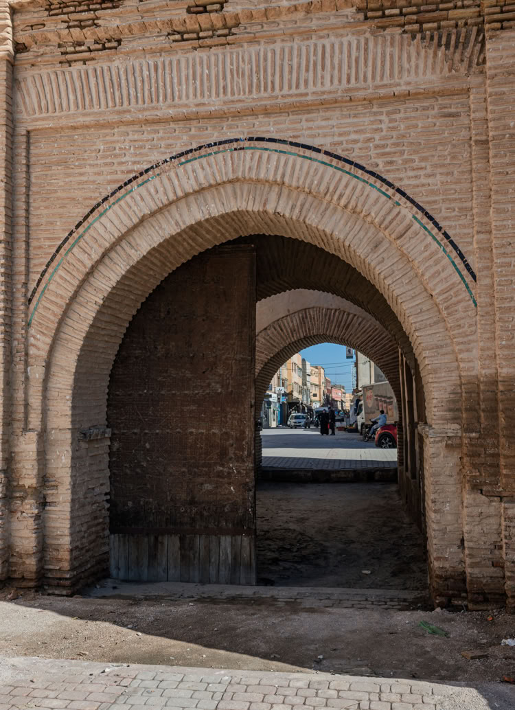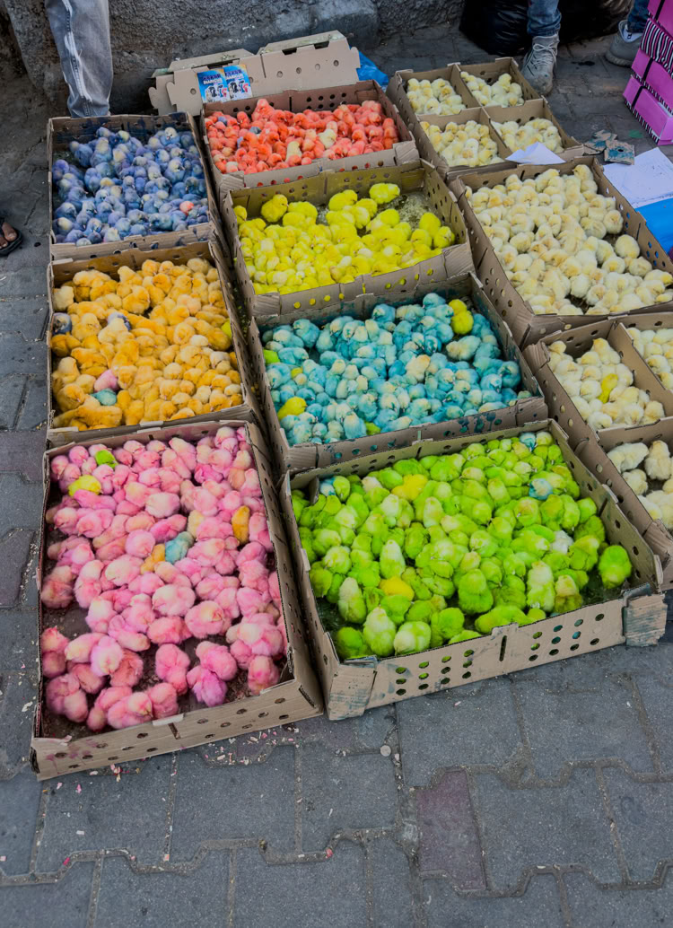 Anfahrt auf Taroudant mit weißen Atlas-Gipfeln. Auf unserem Parkplatz: ein kleiner Gebetsraum. Gegenüber die Werkstatt-Meile. Wie jede Medina ist auch die von Taroudant von einer großen Mauer umgeben, durch die Tore betritt man das bunte Treiben. Bunt sind die zahlreichen Obststände, die befüllten Wasserflaschen. In den Wasserflaschen könnte Waschmittel sein. Aber daneben die pastellfarbenen Dinger - man kommt nicht drauf - sind Küken! Die Marokkaner schrecken vor nichts zurück.