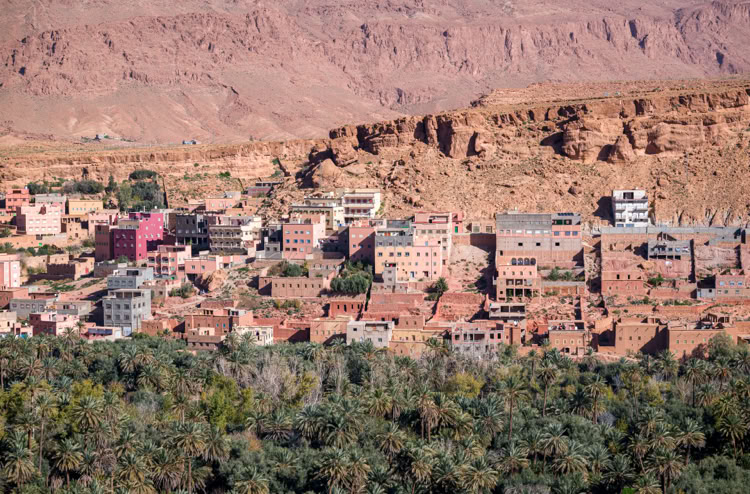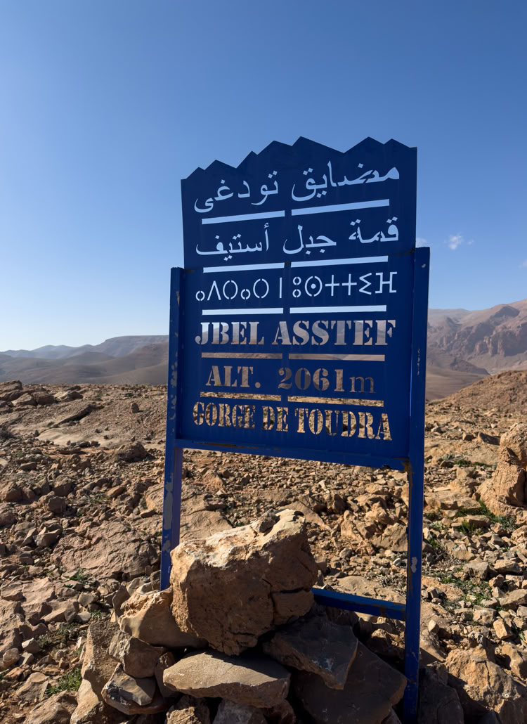 Auf der Anfahrt liegen wunderschöne rote Bergdörfer. Das arabische „Gipfelkreuz finden wir wieder kurios und den Blick in den Canyon grandios!