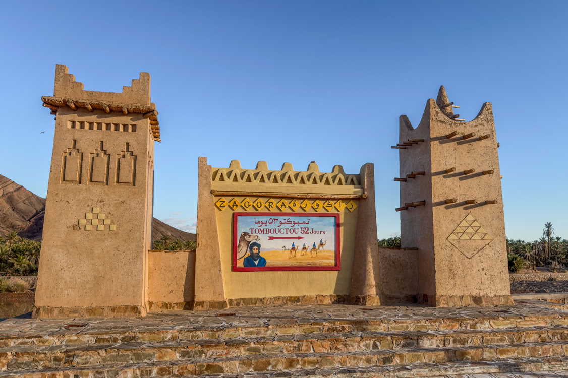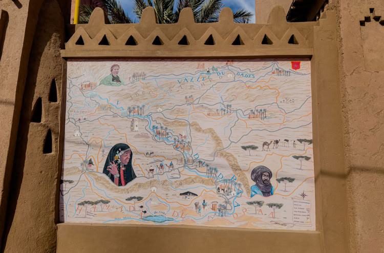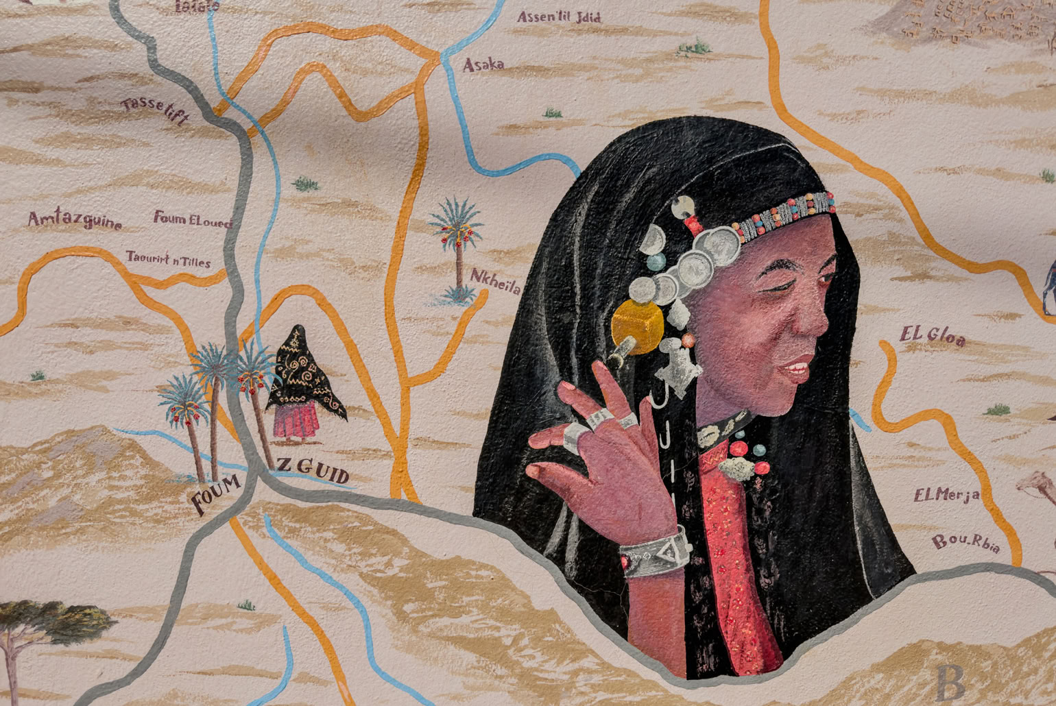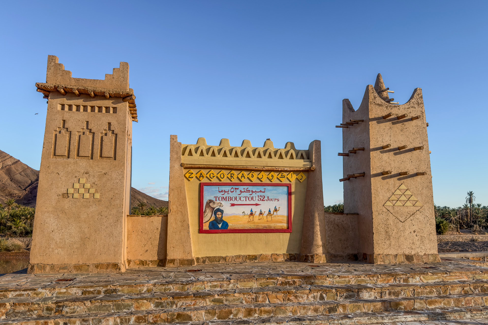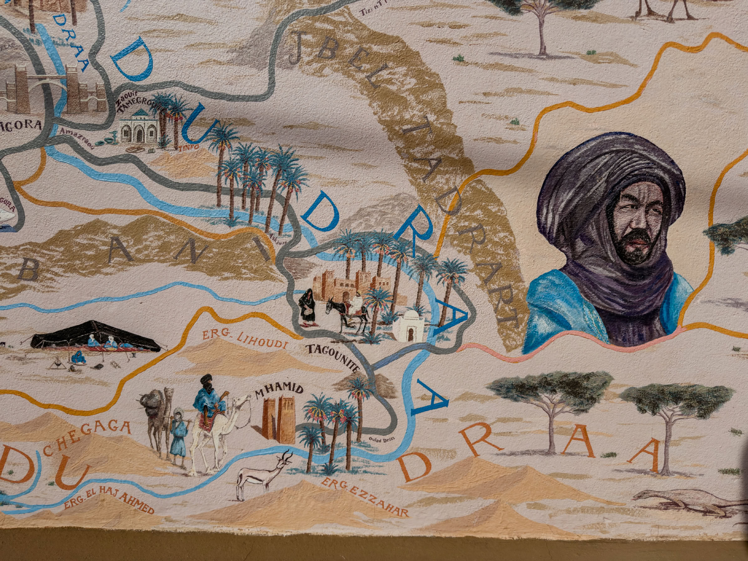 Zagora, früher ein wichtiger Karawanenstützpunkt, ist heute noch wegen der Wandtafel „52 Tage nach Timbuktu“ bekannt. Nur, es gibt diverse Wandmalereien in der Stadt. Und das obige Titelfoto ist eigentlich noch ein bisschen schöner.