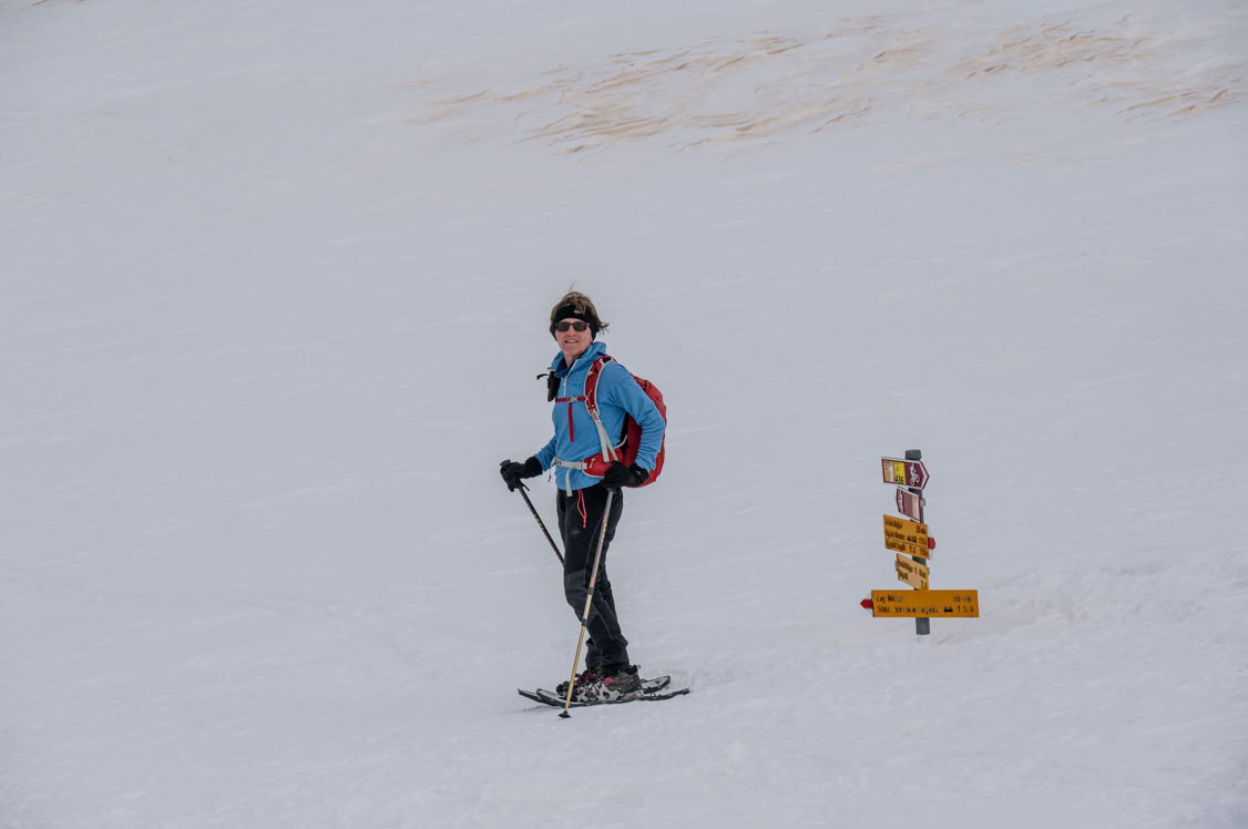 Start einer Schneeschuh-Wanderung, die wenig später mit Wegweisern auf Wadenhöhe weiter geht.