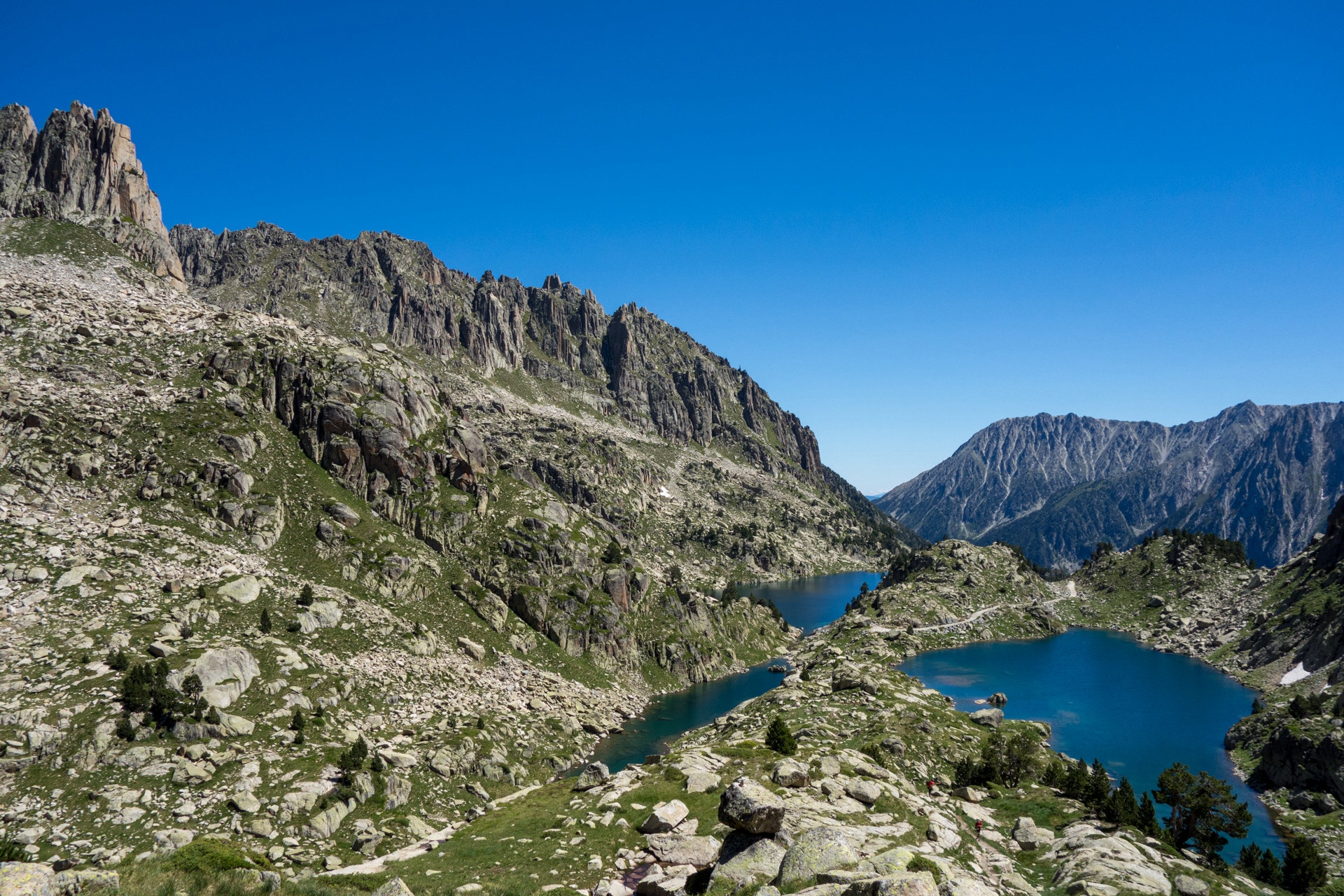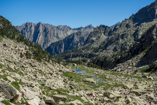 Der Parc Nacional d'Aigüestortes hat seinen Namen von den vielen mäandernden Bächen - „Verdrehte Wasser“. Aber eigentlich hat man das Gefühl, dass man im Land des Wasser an sich gelandet ist. Überall Flüsse, Gebirgsbäche, Wasserfälle, Stromschnellen, Sümpfe, Moore und mehr als 200 Bergseen. Große, kleine, mittlere, winzige. Alle glasklar und tiefblau. Wasser! Und das inmitten einer grandiosen Berglandschaft.