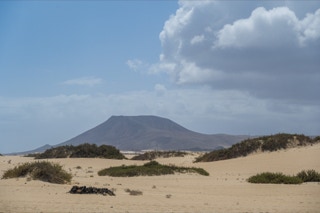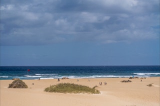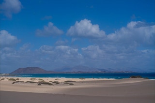 Man fühlt sich gleich ein bisschen nach Afrika versetzt - und man ist ja auch in Afrika. Der Parque Natural de Corralejo ist das größte Dünengebiet der Kanarischen Inseln. Weiße Dünen zwischen rotem Vulkangebirge und blauem Meer. Eine wirklich fotogene Landschaft.