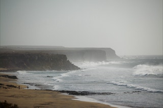 Gleich südlich von El Cotillo schließt sich eine bizarre Steilküste an. Mal ragen die steilen schwarzen Wände direkt bis ins Meer, mal geben sie gerade noch Platz für kleine helle Sandbuchten. Ein herrliches Surfergebiet. Wir sind ja nicht vom Fach, aber jede Bucht scheint ihre besondere Surfcharakteristik zu haben: die eine ist von Kitesurfern besiedelt, die nächste von Wellenreitern, die übernächste von Wing-Surfern und dann gibt es noch die altmodischen „echten“ Surfern. Am letzten Tag kommen dann noch Paraglider hinzu, die die Abbruchkante entlang tanzen. Was ist jetzt spannender? Den Wellen oder den Surfern zuzusehen.
