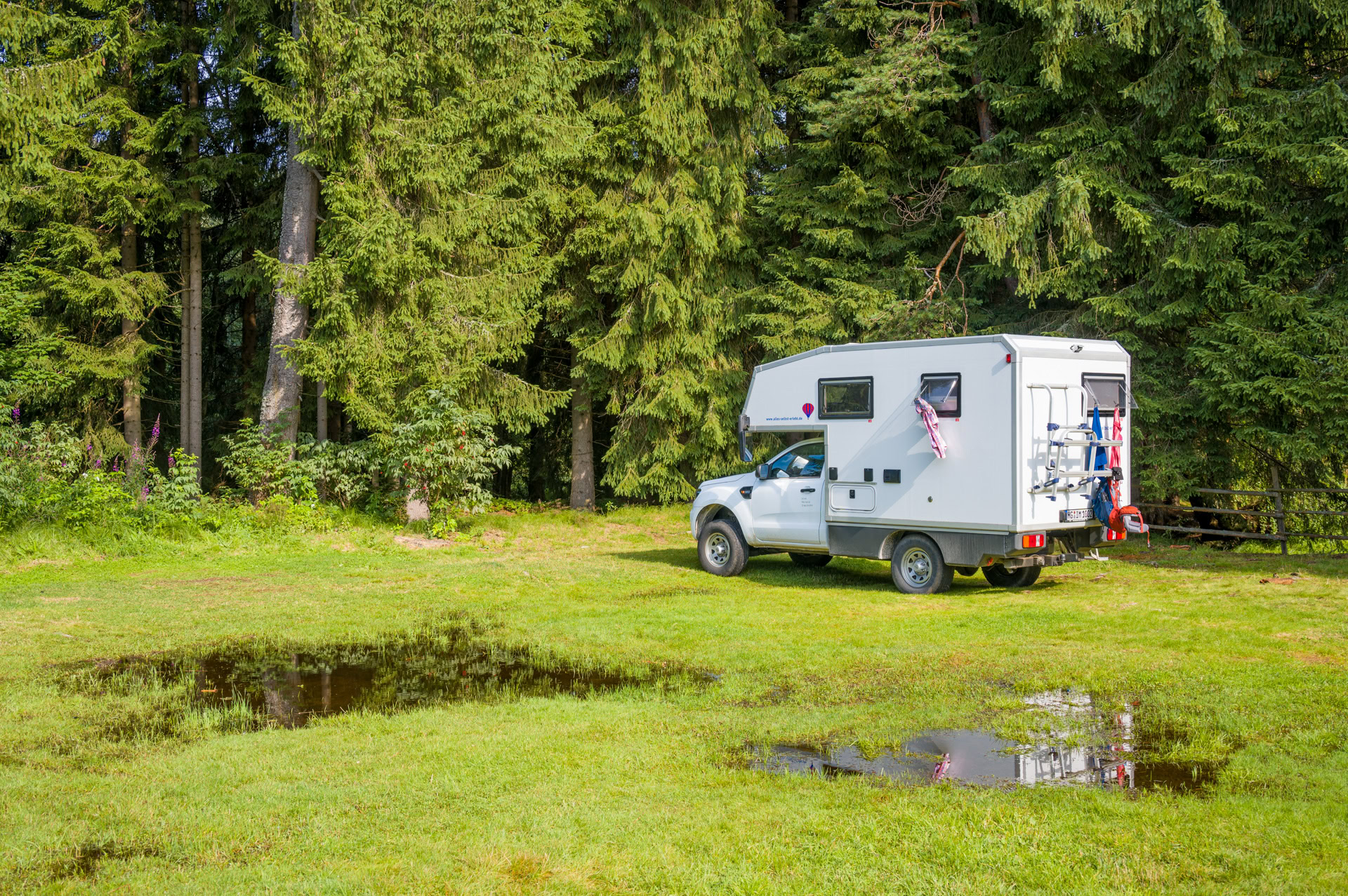 Muskelkater! Die 16 km zum Lakasee stecken uns noch in den Knochen. Aber nicht die Distanz, sondern das Herumstolpern auf nicht navigierbaren Wegen hat seine Spuren hinterlassen. Über Stock und Stein, Wurzeln und Baumstämme, durch Pfützen, Bäche, Sumpf und Moor. Muss ich noch deutlicher werden? Peter konnte schon am Lakasee seine Strümpfe auswringen. Dort nach 8,5 km begegneten wir auch den ersten Menschen. Das Mädchen war heute etwas geschickter und hat gleich die hohen Wanderschuhe angezogen - und blieb trocken. Bis auf den letzten zwei Kilometern der große Regen von oben kam. Danach mussten wir in unserer Dusche eine Trockenkammer einrichten. Am nächsten Morgen stehen wir umringt von sumpfigen Pfützen.