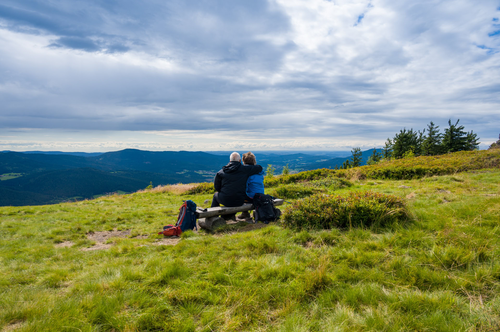 Wie vor vier Jahren gibt sich Tschechien jung, durchgestylt, wander- und fahrradtechnisch bestens ausgerüstet und auf Achse. Jetzt in den Schulferien sind Wanderparkplätze und Campingplätze gut gefüllt. Die Familie mit Schulkindern, die Mehrtages-Männer-Wandergruppe mit vollen Rucksäcken, die Moto-Biker, der Fahrradfahrer und die Zeltlagertruppe der Sieben- bis Zehnjährigen Jungs - fast alle kommen nur mit Zelt nach Prášily auf den kleinen Naturcampingplatz direkt am Stubenbach. Außer uns gibt es nur einen weiteren Caravan - ein circa siebzigjähriges Ehepaar, das morgens erst mal „nackisch“in den Bach steigt und dabei über beide Backen grinst. In der Dämmerung brennt in der Mitte ein riesiges Indianerlagerfeuer, um das zwanzig Leute locker Platz finden. Wir machen unser Feuerchen etwas abseits … und sind eine Stunde später heilfroh, dass wir unter den hohen Fichten Zuflucht finden können. Bis uns zwanzig Minuten später die Regenfront auch von hier ins Auto verscheucht. Ins(!) Auto - was für ein Luxus! Die anderen suchen unter der Heckklappe ihres PKWs Zuflucht oder sind inzwischen längst in ihr Zelt gekrabbelt. Drinnen geht es lustig zu, das Gelächter ist lauter als der Regen auf unserer Kühlerhaube.