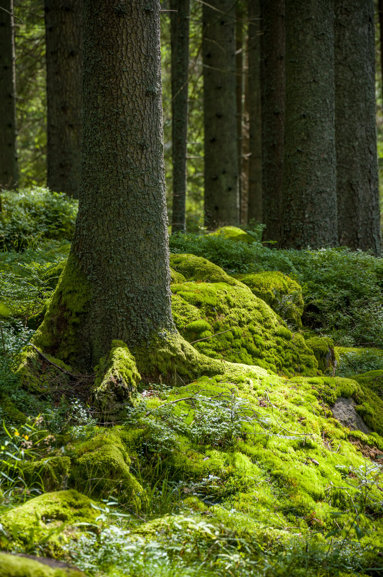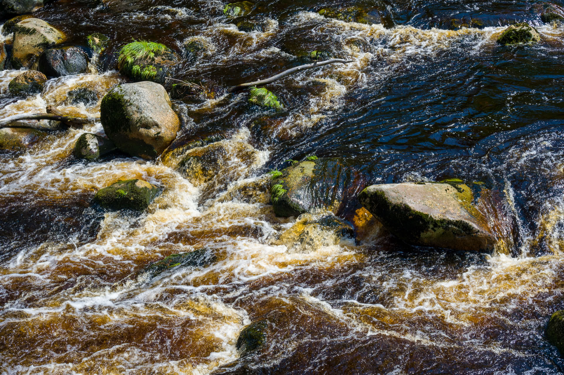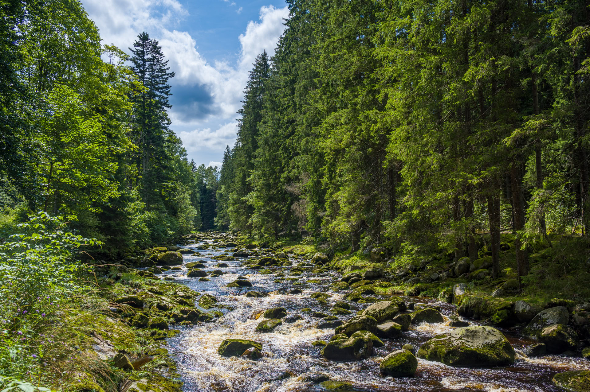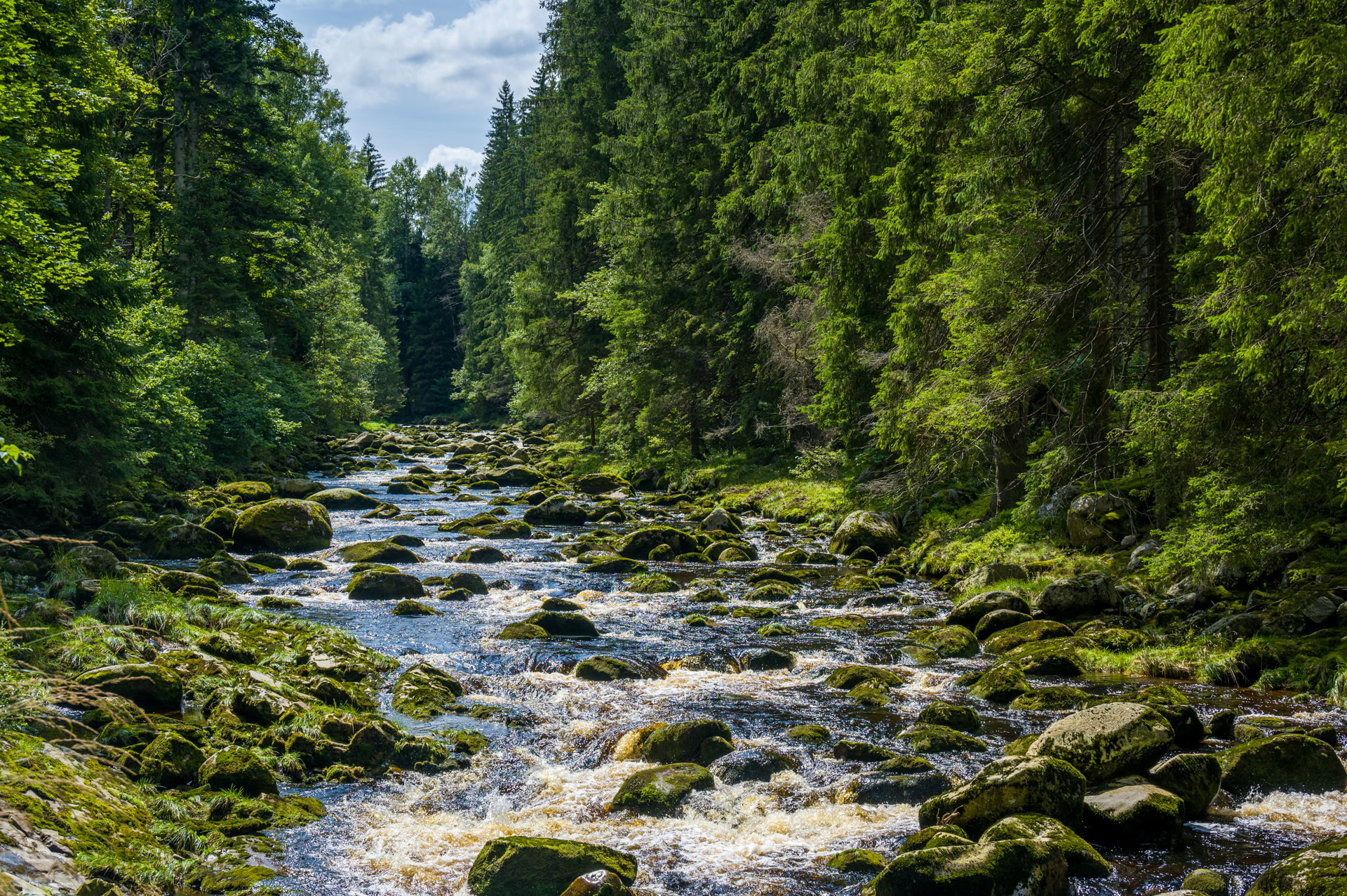 Nach dem Gestolpere gestern entpuppt sich der Weg von Srní/Rehberg durchs Vydratal als Renn-Autobahn. Der Weg selbst ist vielleicht etwas langweilig, aber für Füße und Augen sehr erholsam: rechts sprudelt die Vydra über bemooste Steine, links zieht sich das Moos wie eine Samtdecke über den Waldboden.