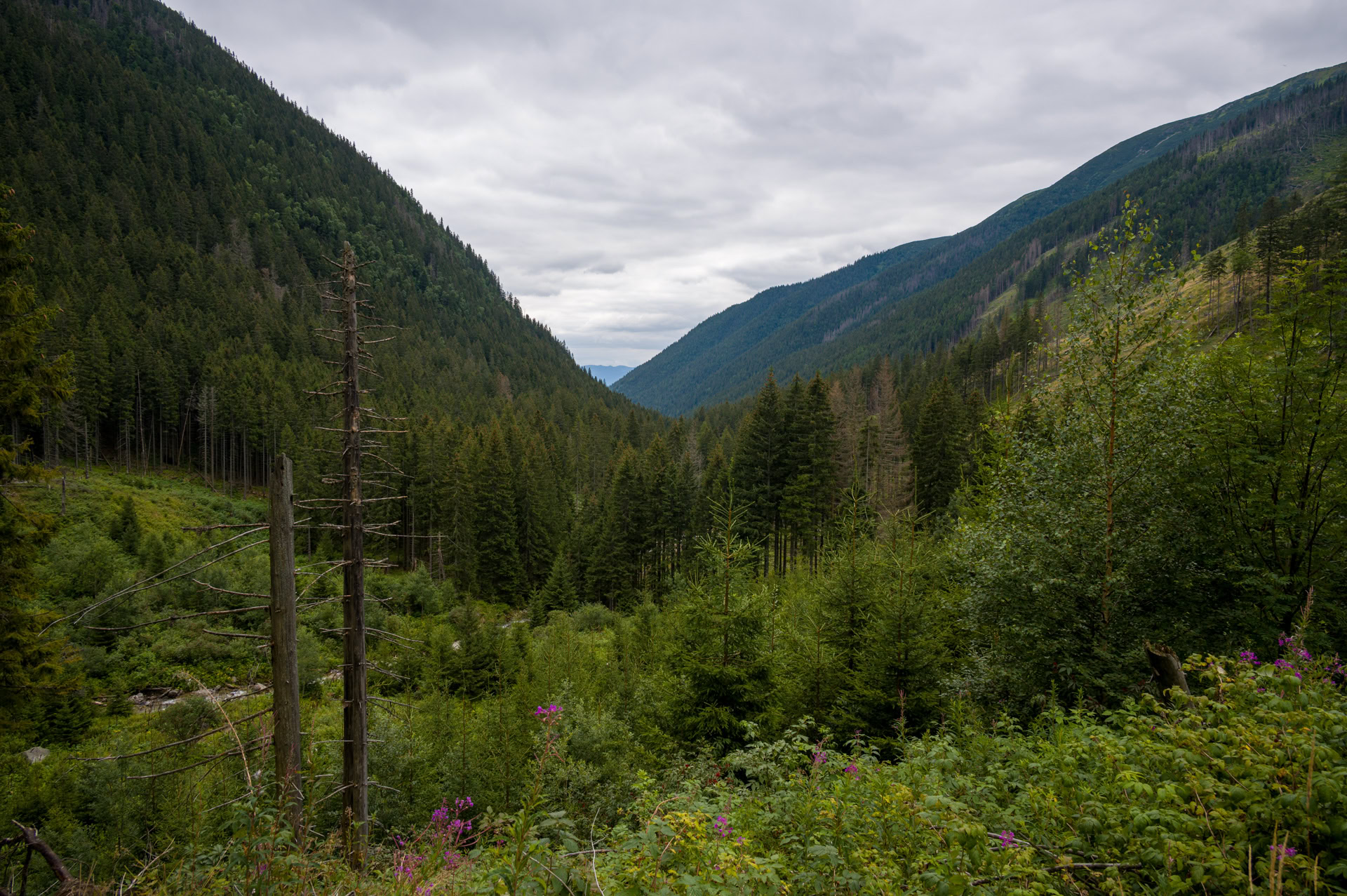 Wir sind uns sofort einig und ergreifen nach zwei Tagen die Flucht - zurück in die Niedere Tatra, auf den Naturcampingplatz Račkova Dolina. Herrlich, wir stehen unter hohen Tannen direkt am Bach Račkova und hören nichts als dessen Geplätscher.