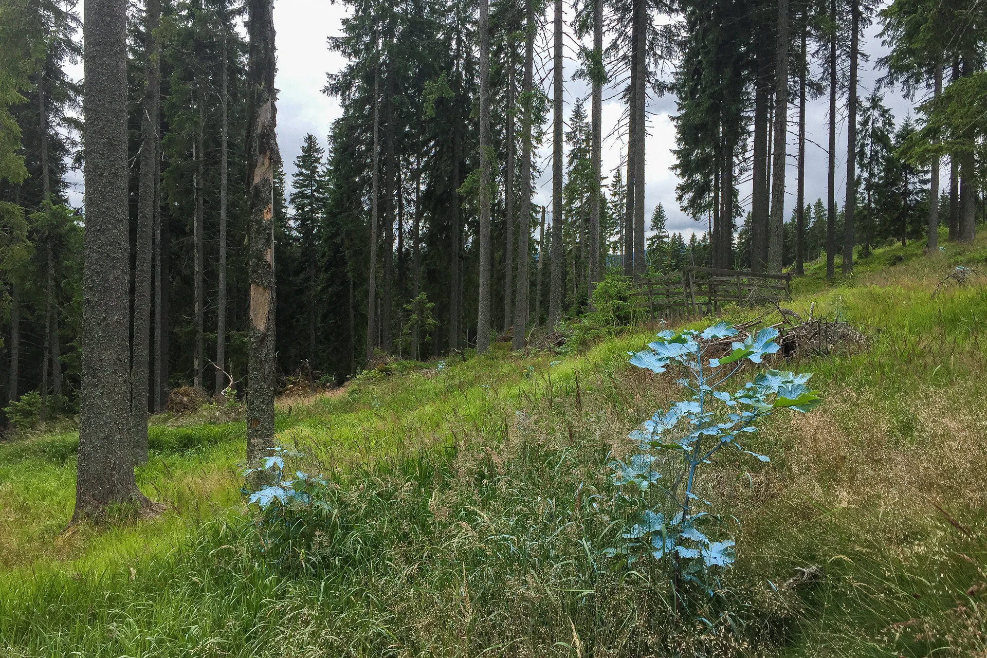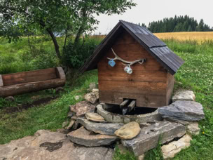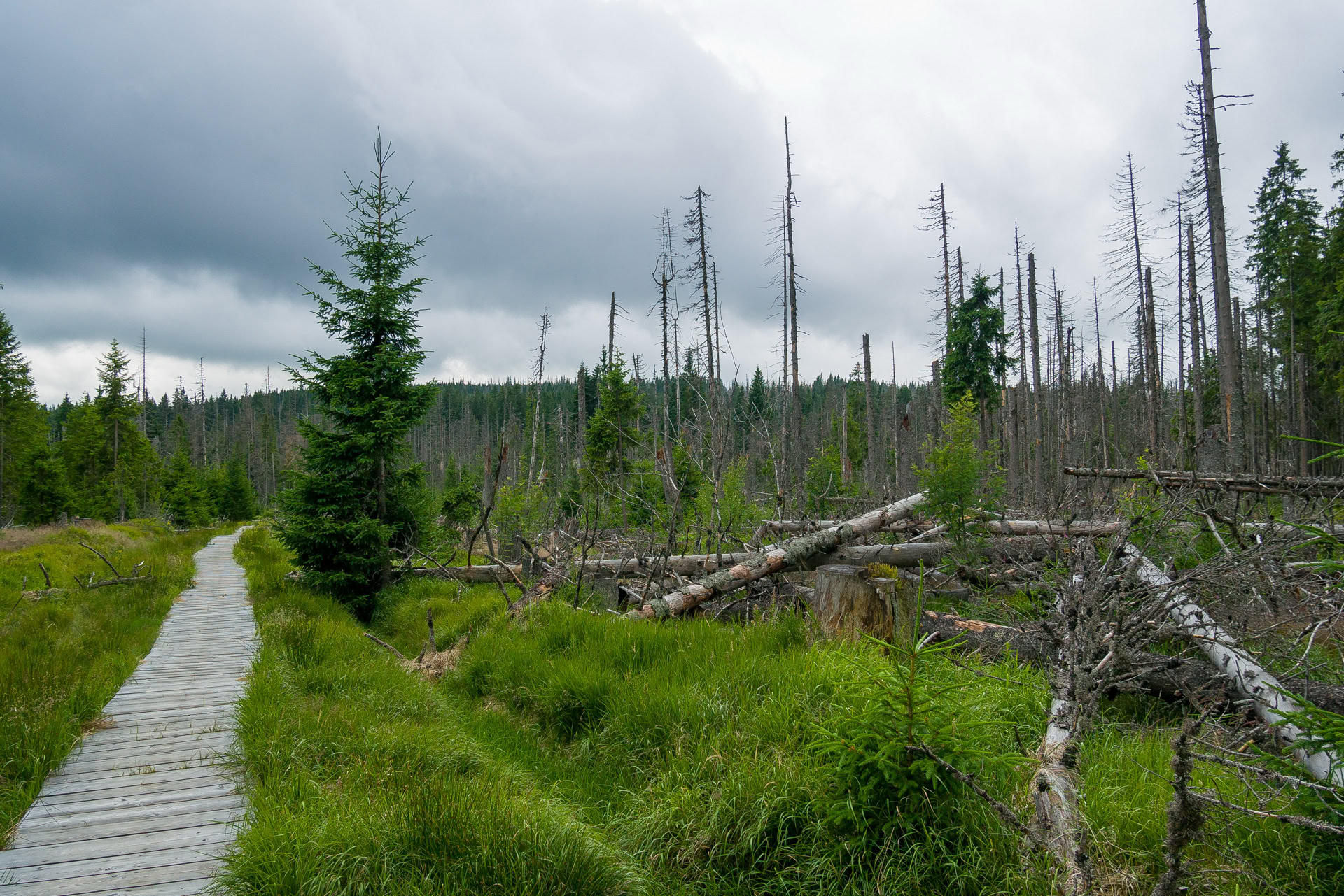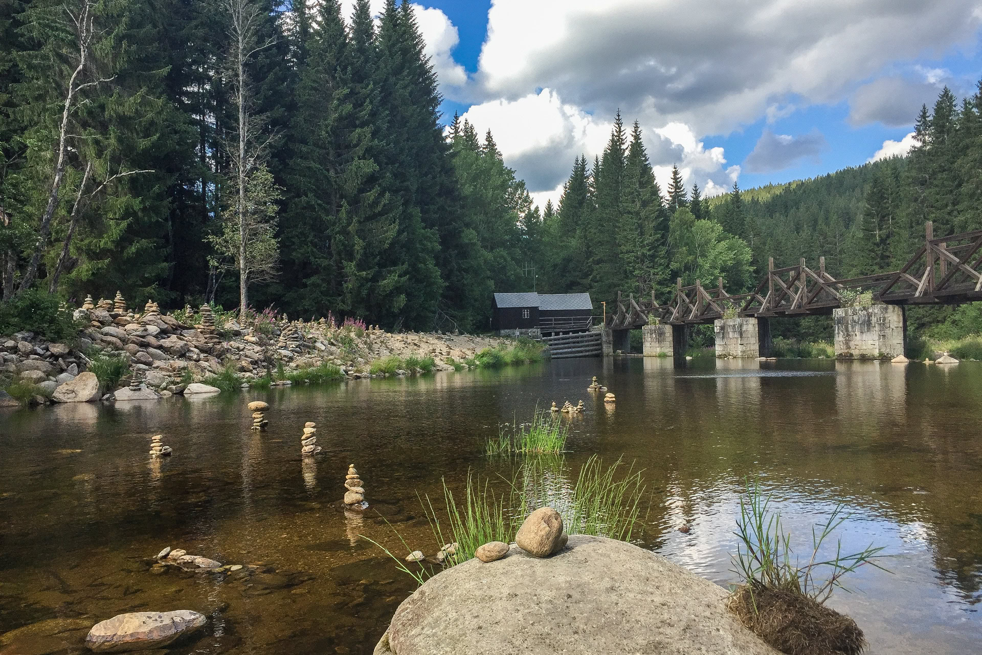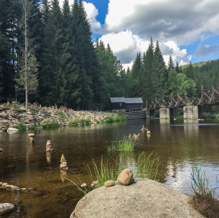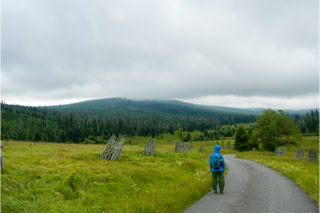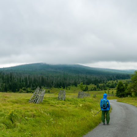 Natürlich sind wir nicht (nur) zum Essen gekommen, wandern von unserem Übernachtungsplatz bei der Brücke Hradlový most /Rechle nach Modrava und einen Tag später von dort zur früheren Einöde Březník entlang idyllischer Flussauen, alter Flößerkanäle, durch Urwälder und Blumenwiesen und packen auch zum ersten Mal unsere Regenjacken und Hosen aus.