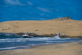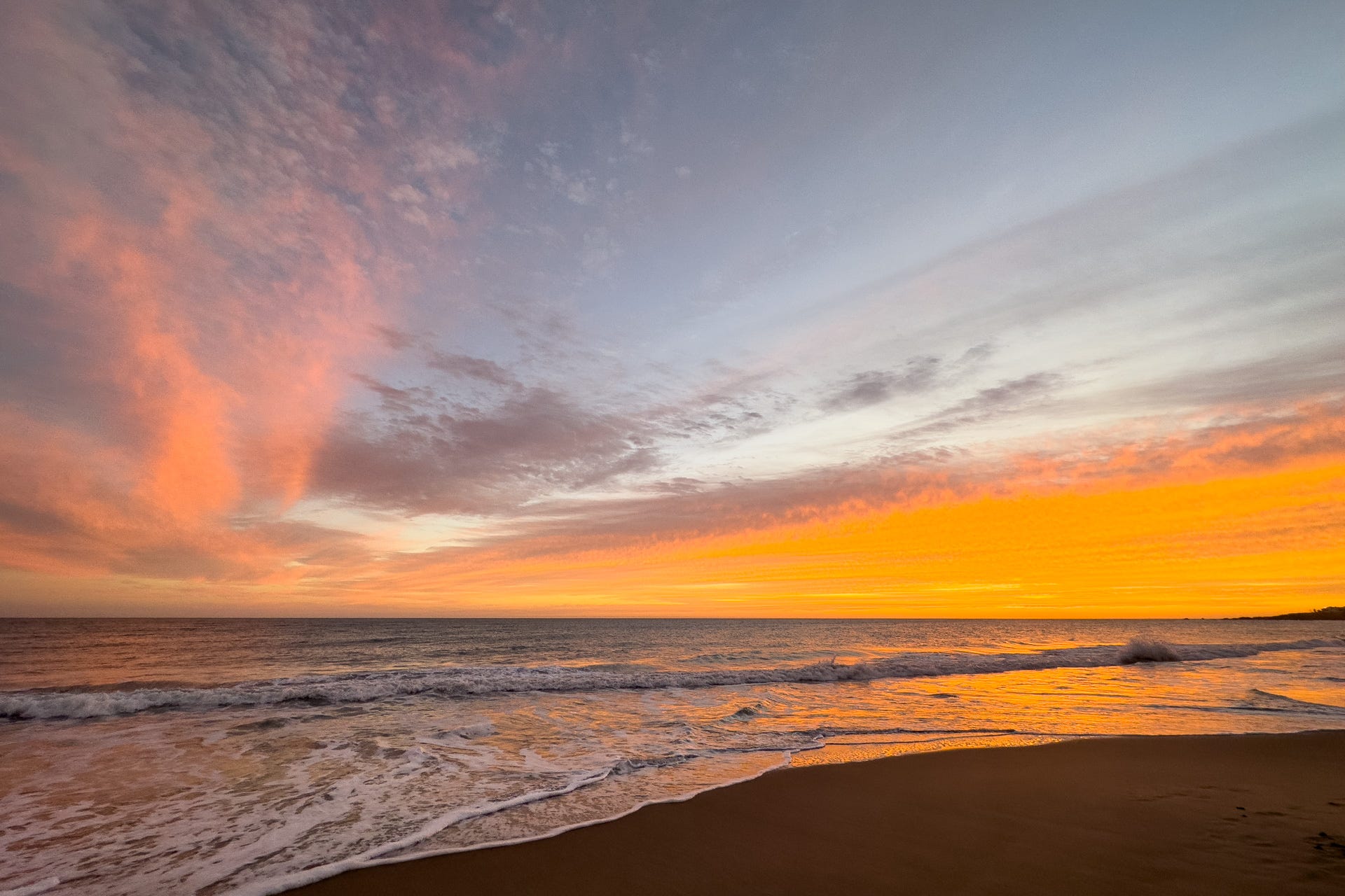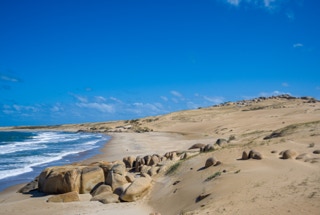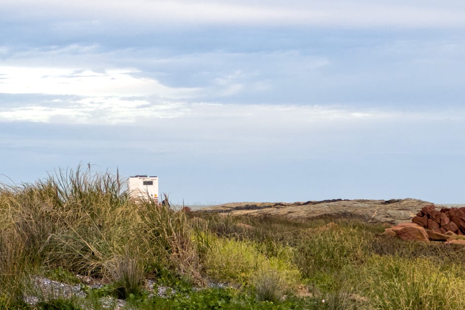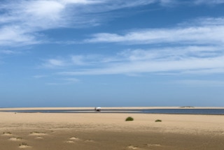 Unser Reiserhythmus passt sich diesem Ziel an - wir sind noch langsamer als sonst. Wir bleiben jeweils zwei bis drei Tage an einem Plätzchen, irgendwo hinter einer Düne versteckt oder im Eukalyptuswald oder einfach an einem unendlichen Strand. Jeden Tag kilometerlange Strandspaziergänge, fantastische Sonnenuntergänge, Stürme und Gischt. Mal kommt kein Mensch, mal kommt ein Mensch. Der hat einen Hund dabei oder sitzt auf seinem Moped oder Quad und fährt ein bisschen durch die Dünen.