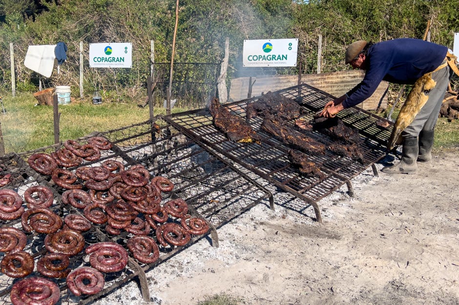 Sonntag Morgen, viele rausgeputzte Gauchos, Pferde, Grills mit pfannengroßen Bratwurstschnecken, noch größeren Fleischlappen, Stände mit Pferdeklimbim, eine Westernband auf der Bühne. Wir dazwischen. Lustig, oder?