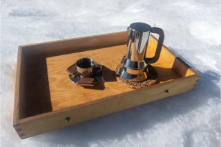 Schweden 2012, Muddus NP. Mit selbst gebasteltem Tablett zum Cappuccino-Platz.